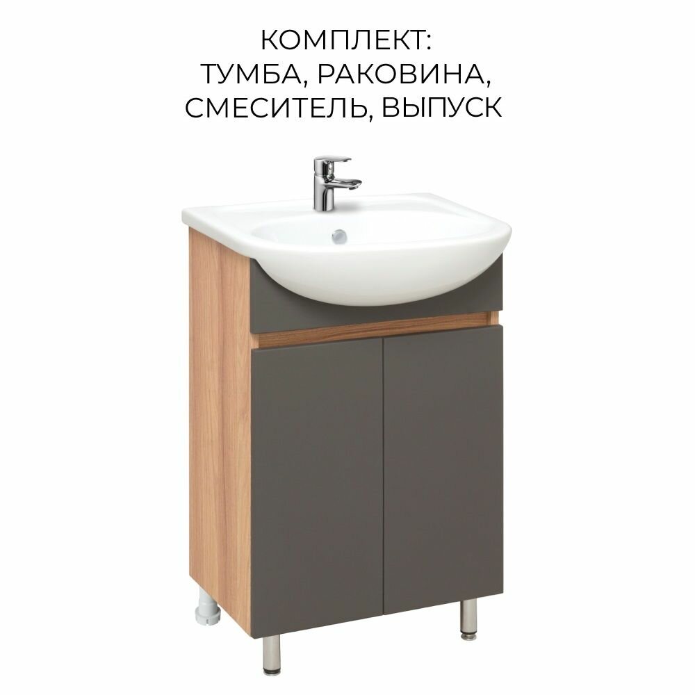 Тумба с раковиной для ванной Runo Лада 50, графит, раковина, смеситель, выпуск