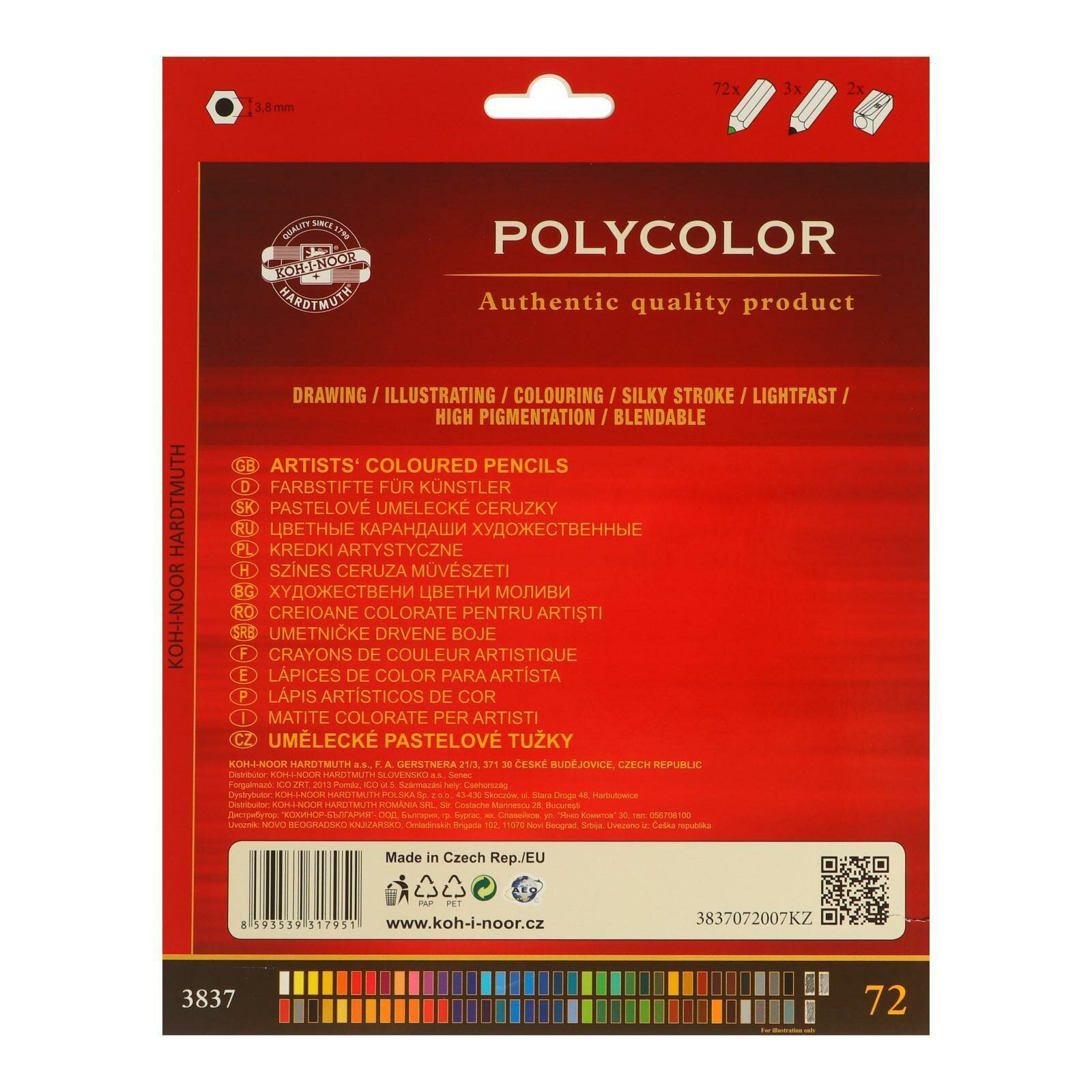 Карандаши цветные KOH-I-NOOR художественные Polycolor 3837, 72 цвета, 2 точилки, картон, европодвес