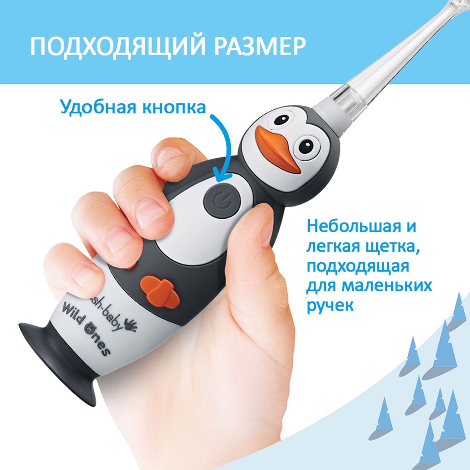Brush-Baby WildOnes Детская электрическая аккумуляторная зубная щетка, 1 ручка, 3 насадки-щетки, USB-кабель для зарядки, для детей 0-10 лет (Pengiun)