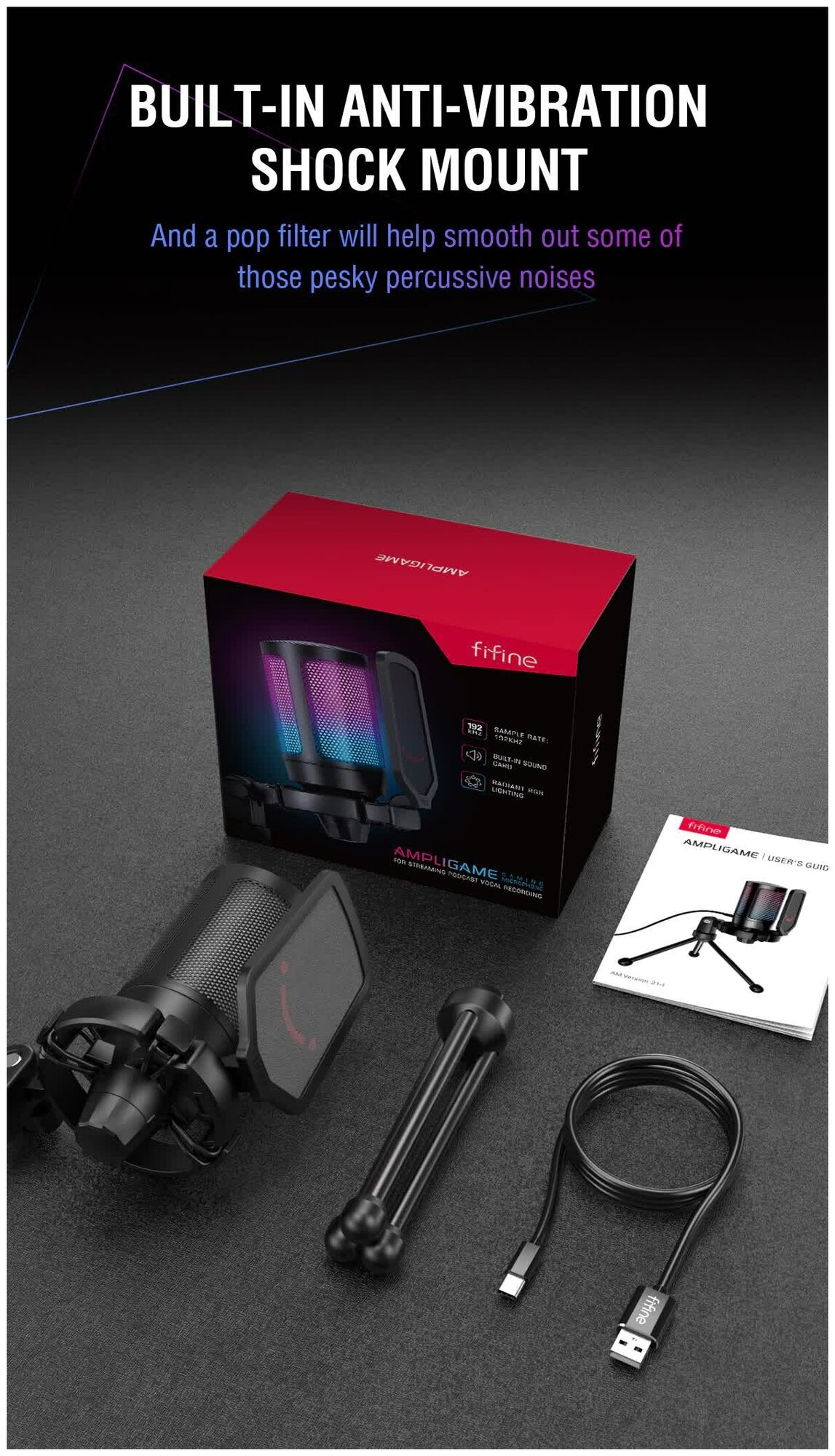 Конденсаторный USB Микрофон Fifine A6V Ampligame с RGB-подсветкой (компьютерный, игровой, для стримов, для конференций, Black)