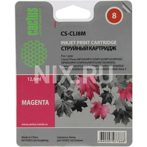 Картридж струйный Cactus CS-CLI8M пурпурный (12мл) для Canon Pixma MP470/MP500/MP510/MP520/MP530/MP600/MP800/MP810/MP830/MP970/iP3300/iP3500/iP4200/iP5200/iP5300/iP6600D/iP6700D/MX700/MX850/iX4000/iX5000/Pro9000/9000Mark II