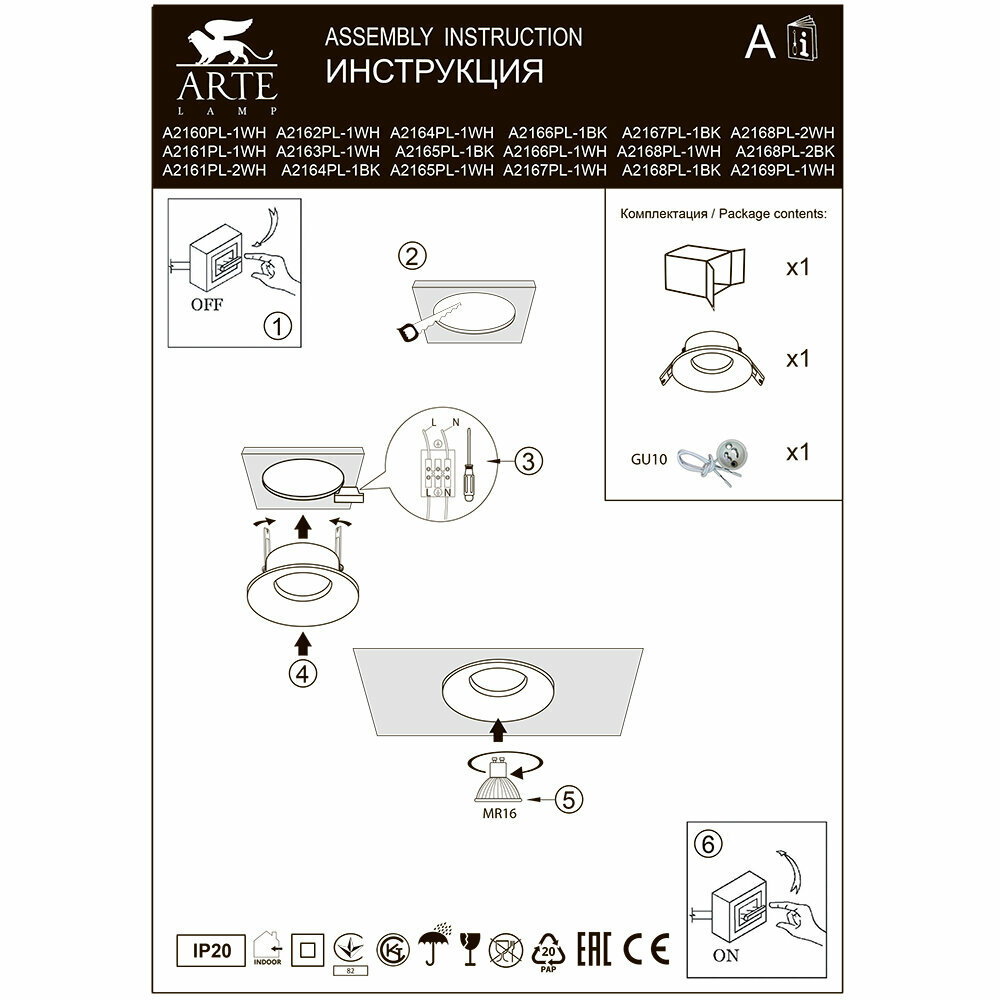 Светильник встраиваемый ARTELAMP A2167PL-1WH