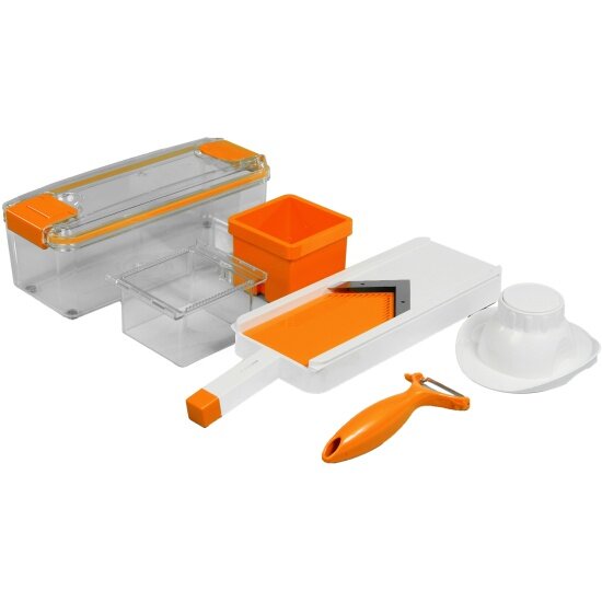 | Отзыв: | толщина ломтика регулируется на рукояти, от супертонкого до 6 мм. нож для нарезки соломкой выдвигается рычагом. можно выставить 0 уровень, ножи полностью прячутся. контейнеры как бонус, плододержатель неплохой. рекомендую, хорошая калька американской терки. |