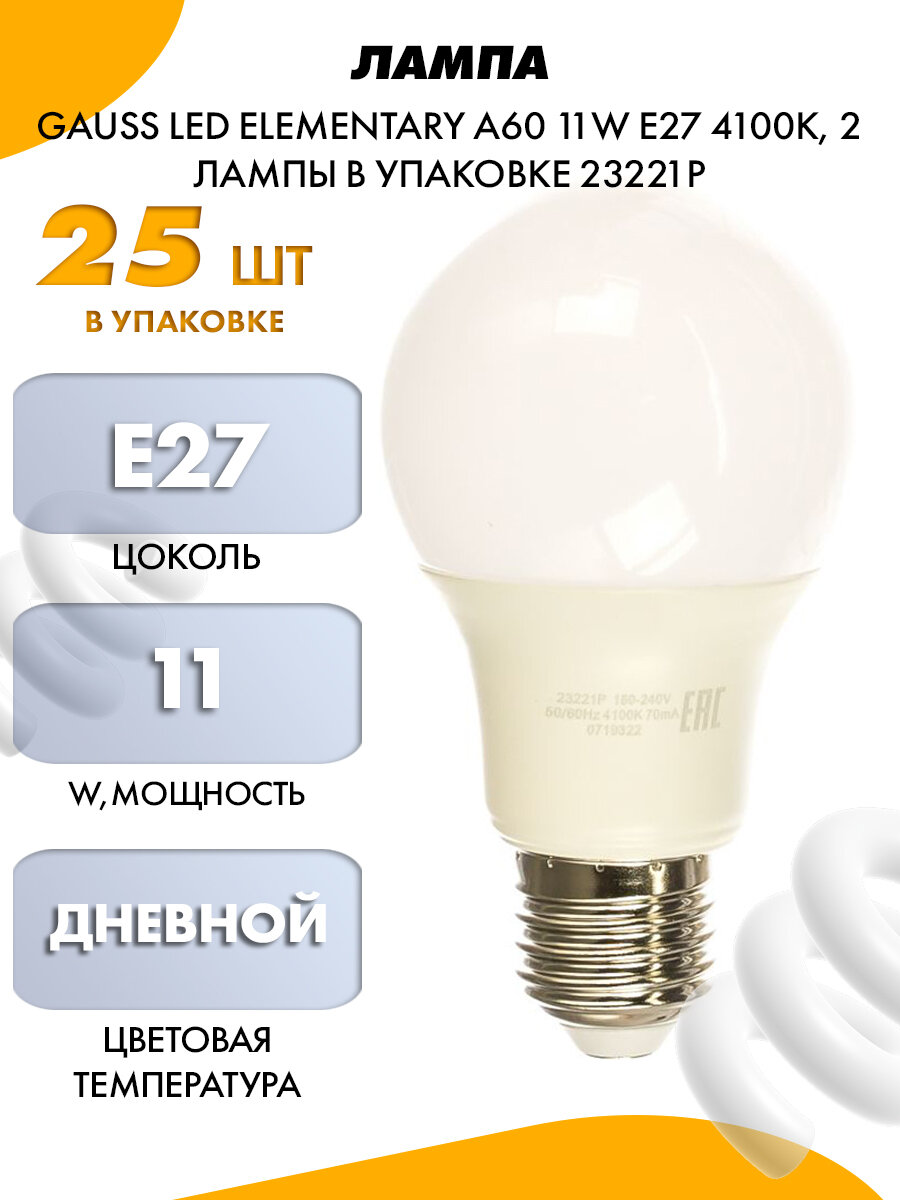 Упаковка светодиодных ламп 2 шт. gauss Elementary 23221P, E27, A60, 11Вт, 4100 К