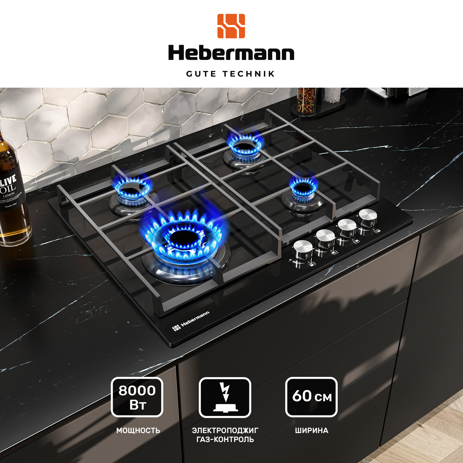 Газовая варочная панель Hebermann HBGG 604.1 B, ширина 60 см, закаленное стекло, 4 конфорки, 8000 Вт