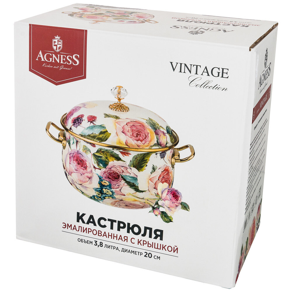 Кастрюля 4,8 л эмалированная с крышкой, для индукционных плит Agness Винтаж. Пионы, 4,8 литра с антипригарным покрытием для газовой плиты