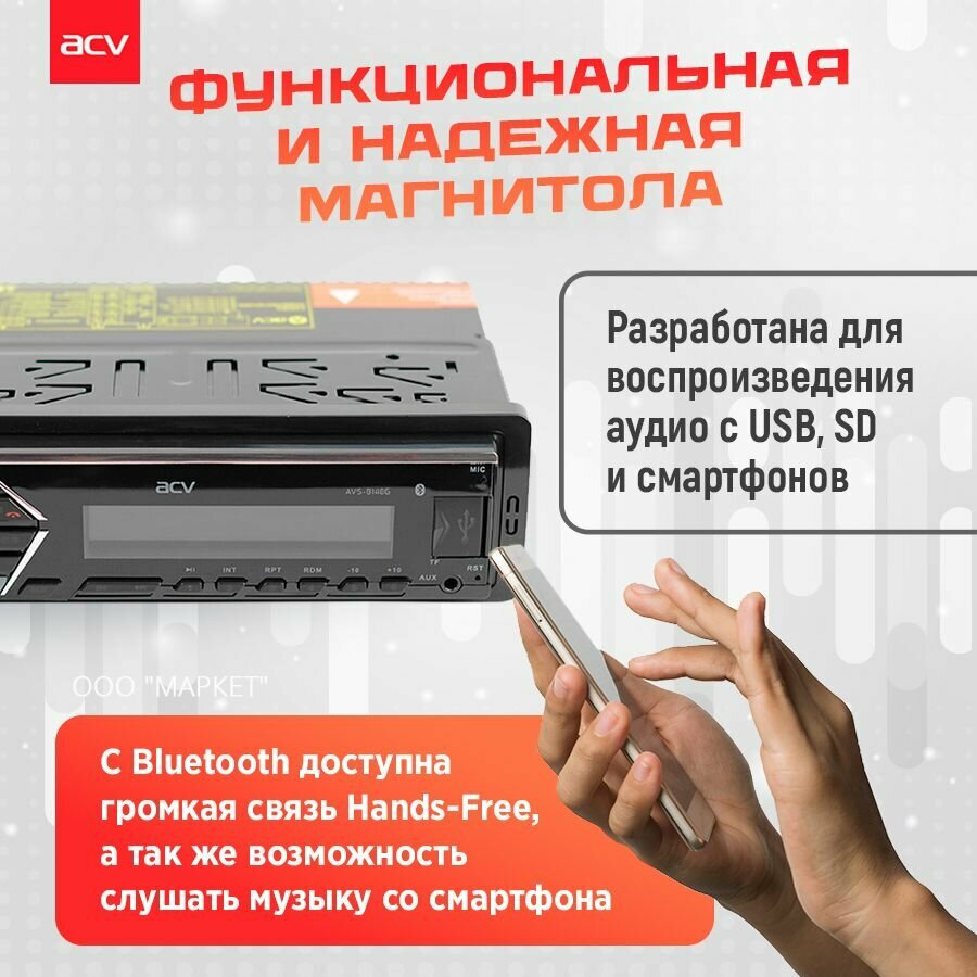 Автомагнитола acv fm/mp3/usb/sd bluetooth зеленая подсветка несъемная панель avs-814bg
