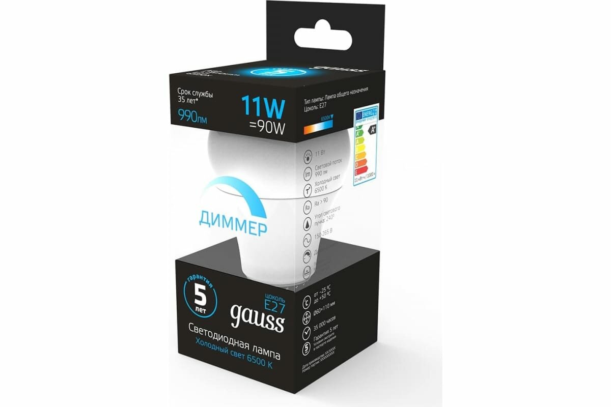Светодиодная лампа Gauss A60 11W 990lm 6500К E27 диммируемая LED 1/10/50