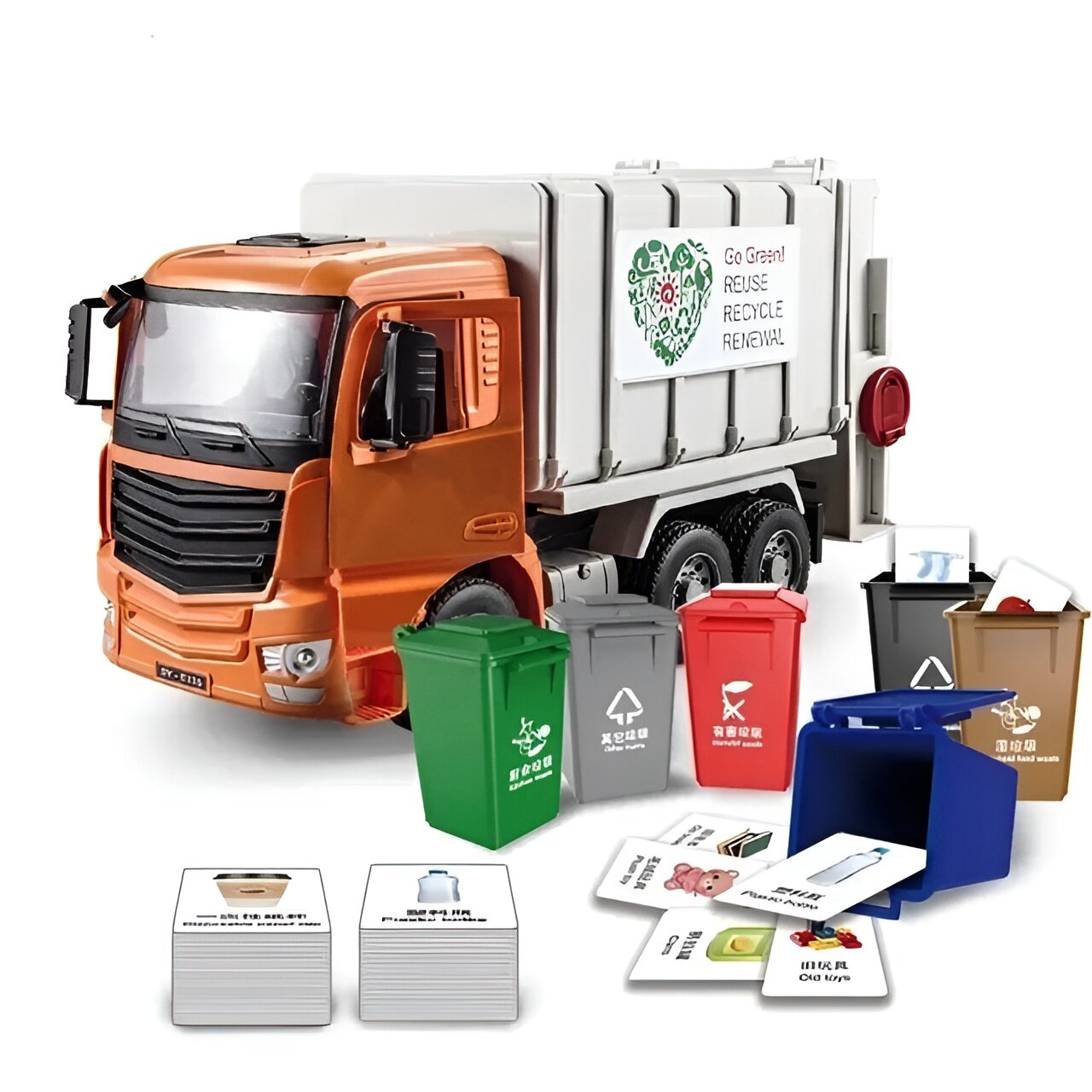 Многофункциональный мусоровоз сортировщик на пульте управления Double Eagle Mercedes-Benz Antos, 1:20, 41 см, оранжевый/белый