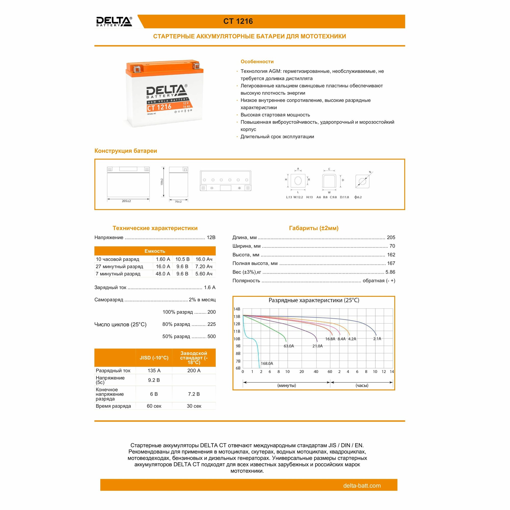 Аккумулятор мото DELTA AGM CT 1216 16Ah 200A обратная полярность (205х70х160) мотоцикла