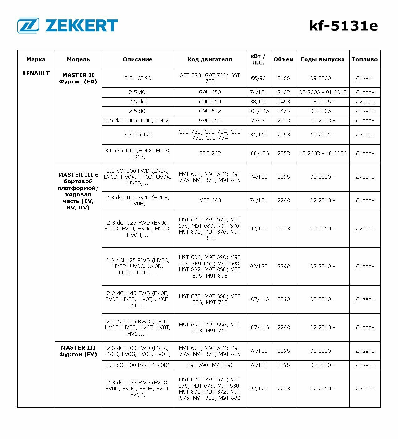Фильтр топливный NISSAN: INTERSTAR 03-, INTERSTAR автобус 02-, INTERSTAR фургон 02-, PRIMASTAR автоб Zekkert KF5131E