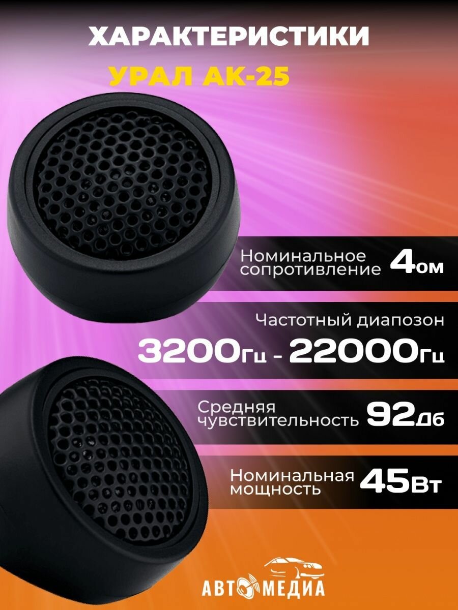 Акустическая система Урал АК-25, 2 Динамика, 1 дюйм (2,5 см), 3200 - 22000 Гц, 90/45 Вт