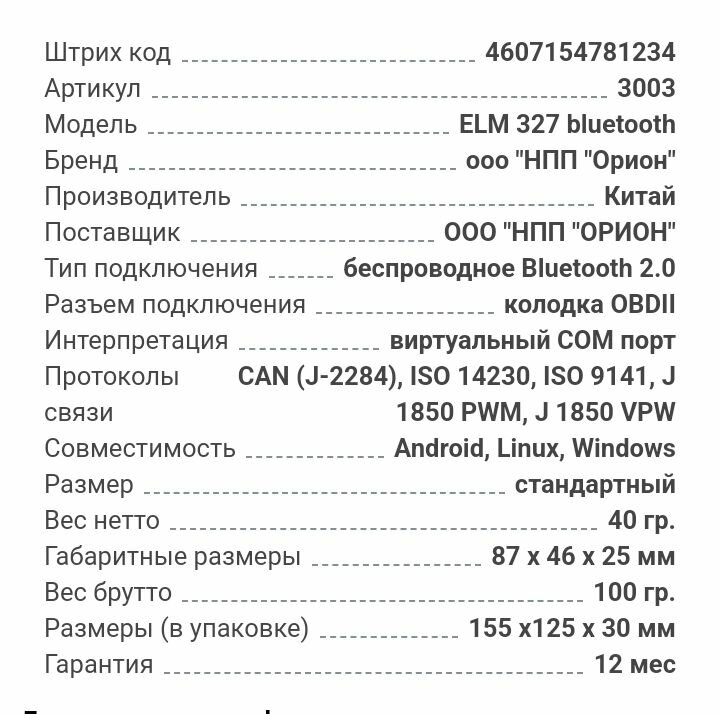 Адаптер для диагностики ELM 327 Bluetooth, OBD-II (НПП Орион) (3003) интересное: