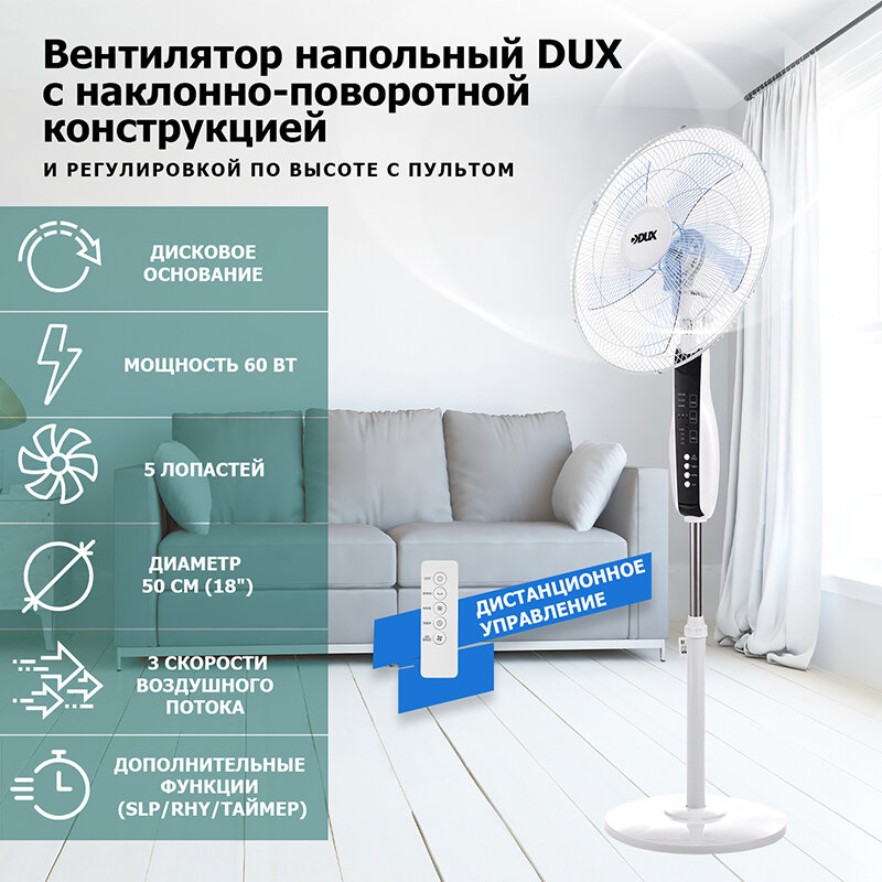 Купить Вентилятор напольный DUX 60 Вт, 5 лопастей, подставка круглая, д/у управление, белый/синий