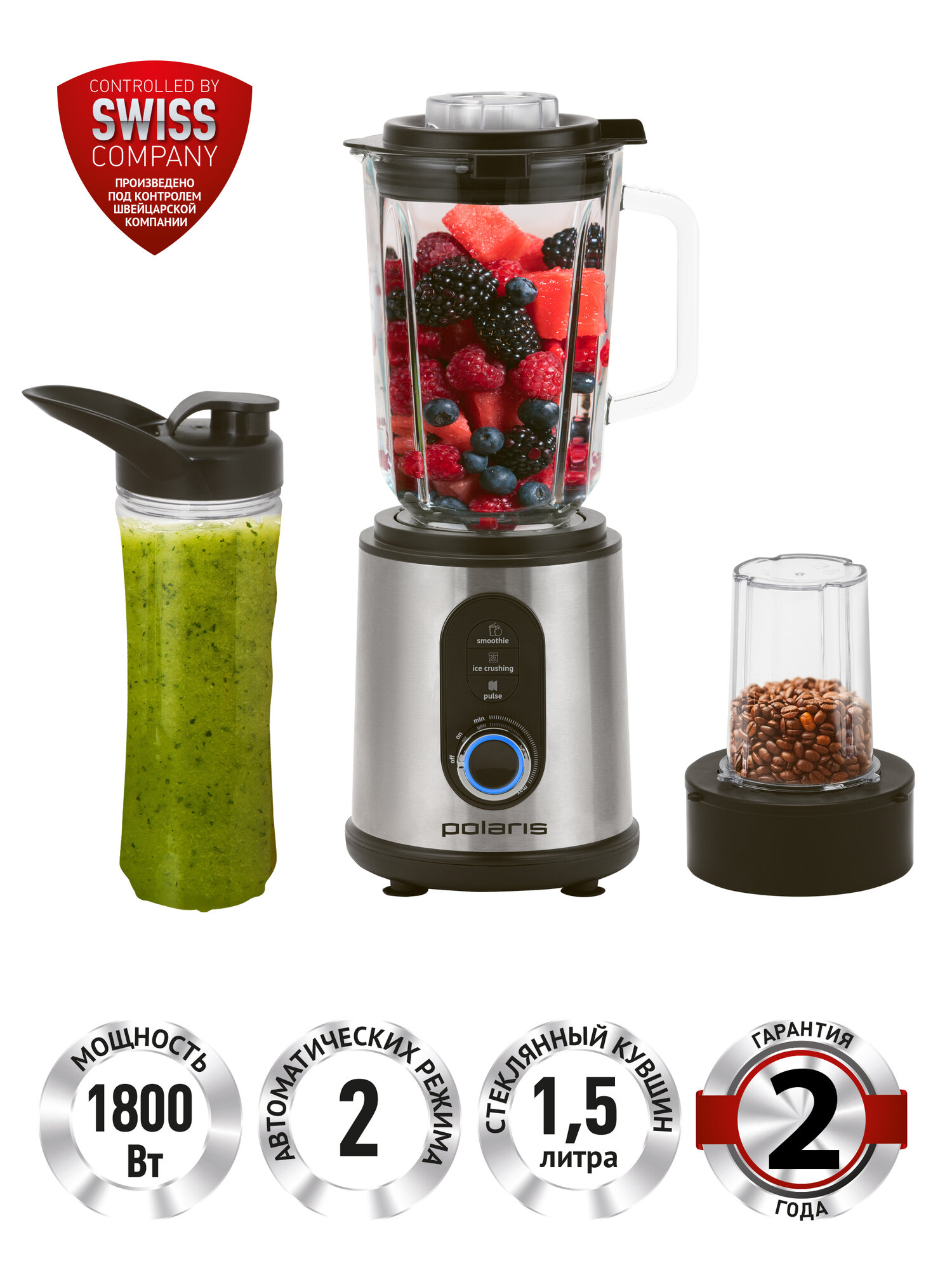 Настольный высокоскоростной блендер с мини измельчителем Polaris PTB 1834G