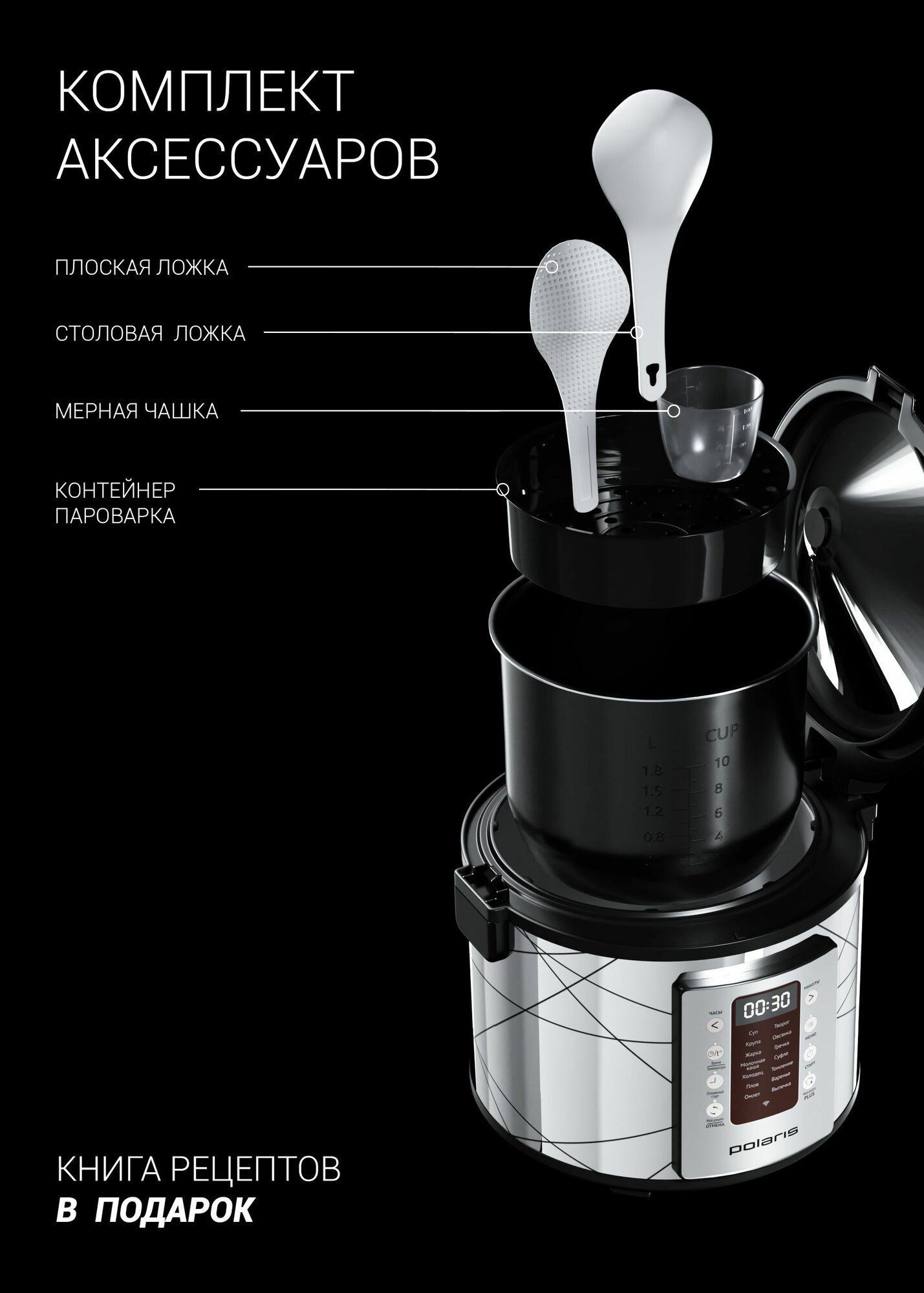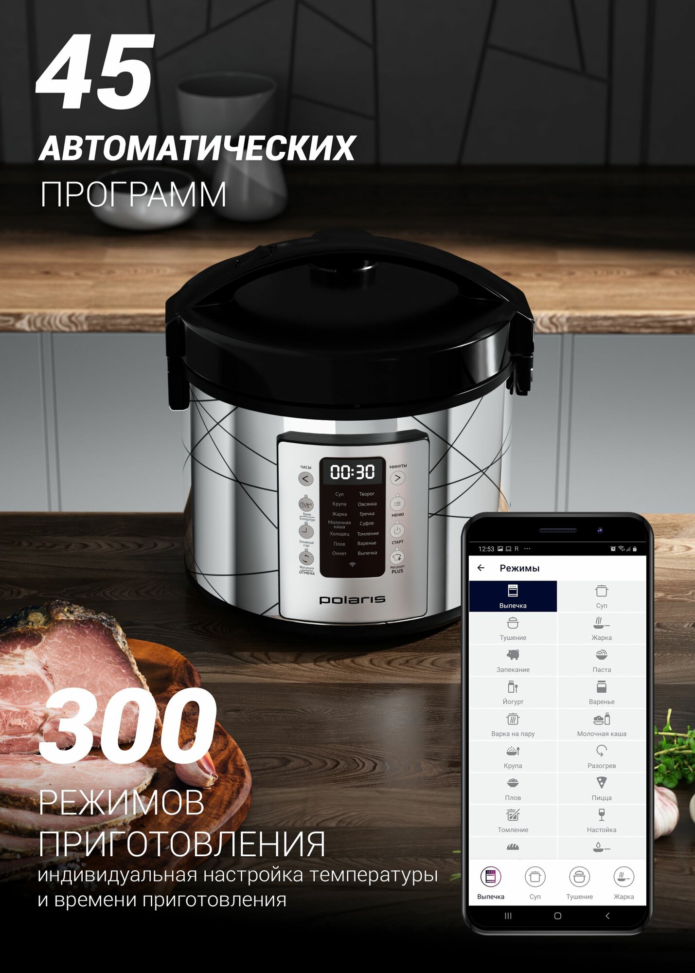 Умная мультиварка Polaris PMC 5020 Wi-Fi IQ Home, антипригарная чаша 5 литров, 45 автопрограмм, 700+ рецептов от шеф-поваров, серебристый