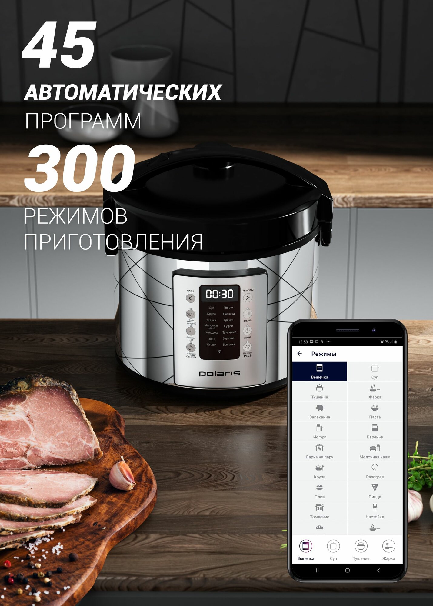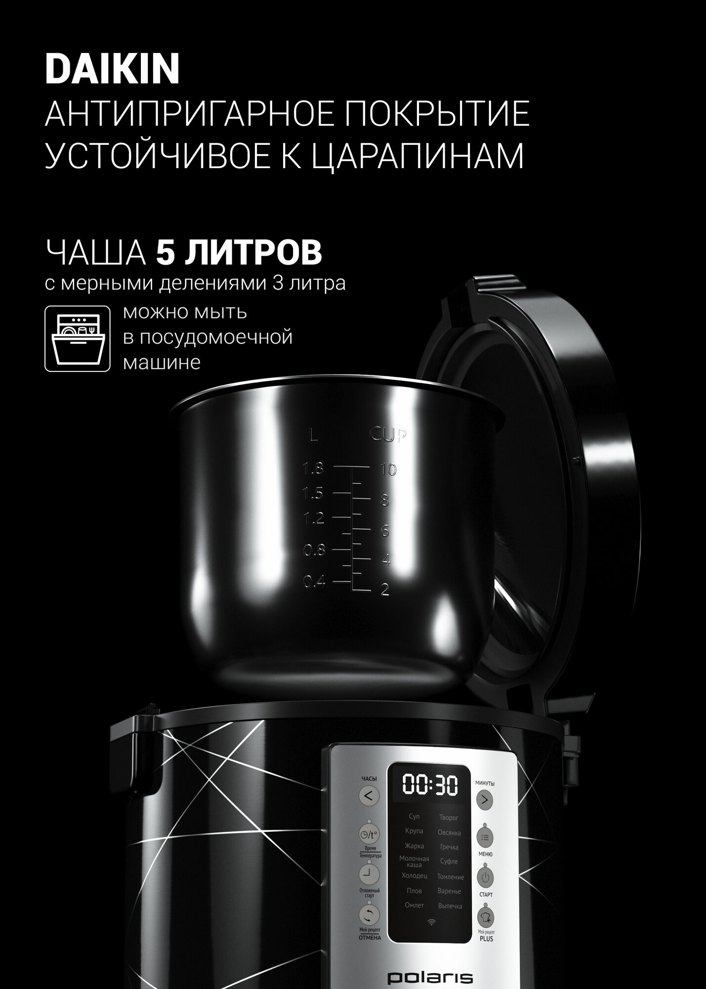 Умная мультиварка Polaris PMC 5020 Wi-Fi IQ Home, антипригарная чаша 5 литров, 45 автопрограмм, 700+ рецептов от шеф-поваров, черный
