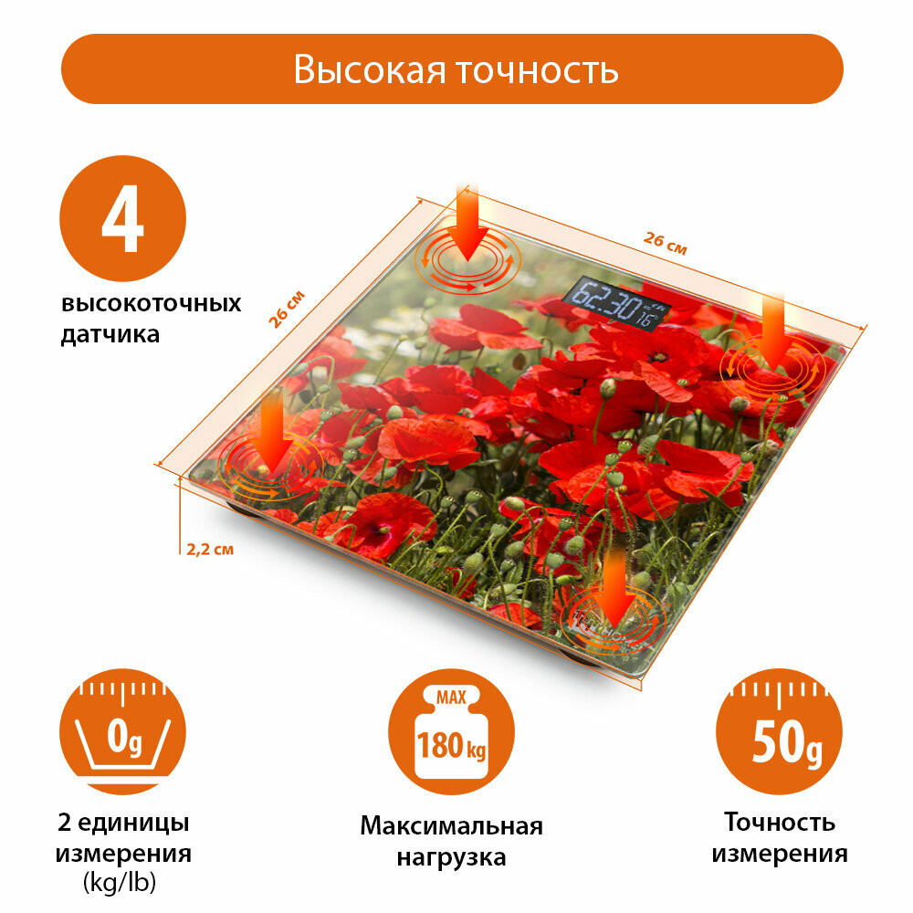 Весы напольные Home Element HE-SC906 красные маки стекло, LСD дисплей, автовыключение, деления .