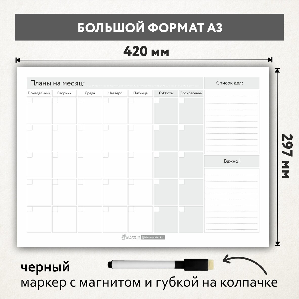 Планер магнитный А3 - на месяц со списком дел и важными заметками, маркер с магнитом, Бело-серый фон #000 №9, planner_background_white_#000_А3_9 интересное: