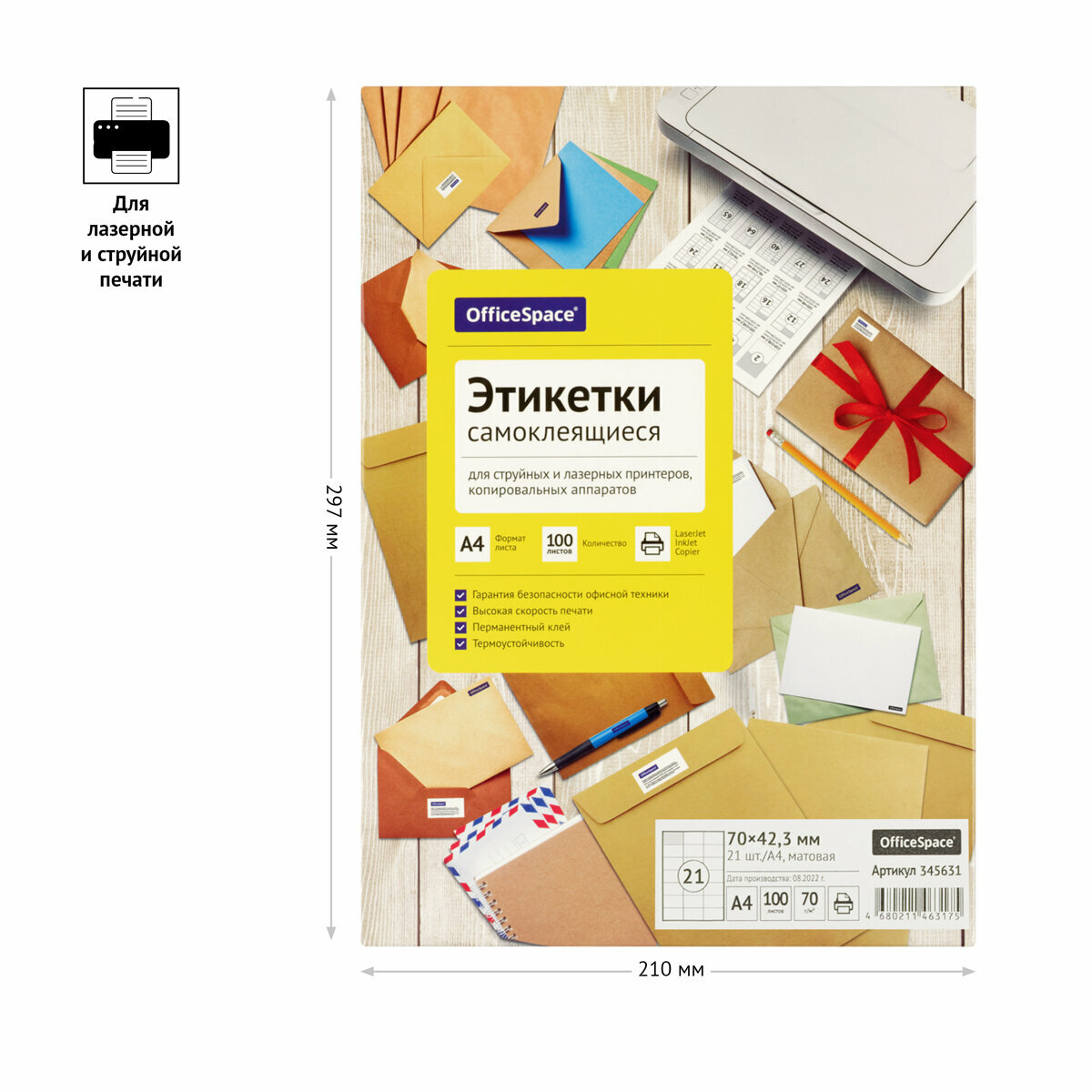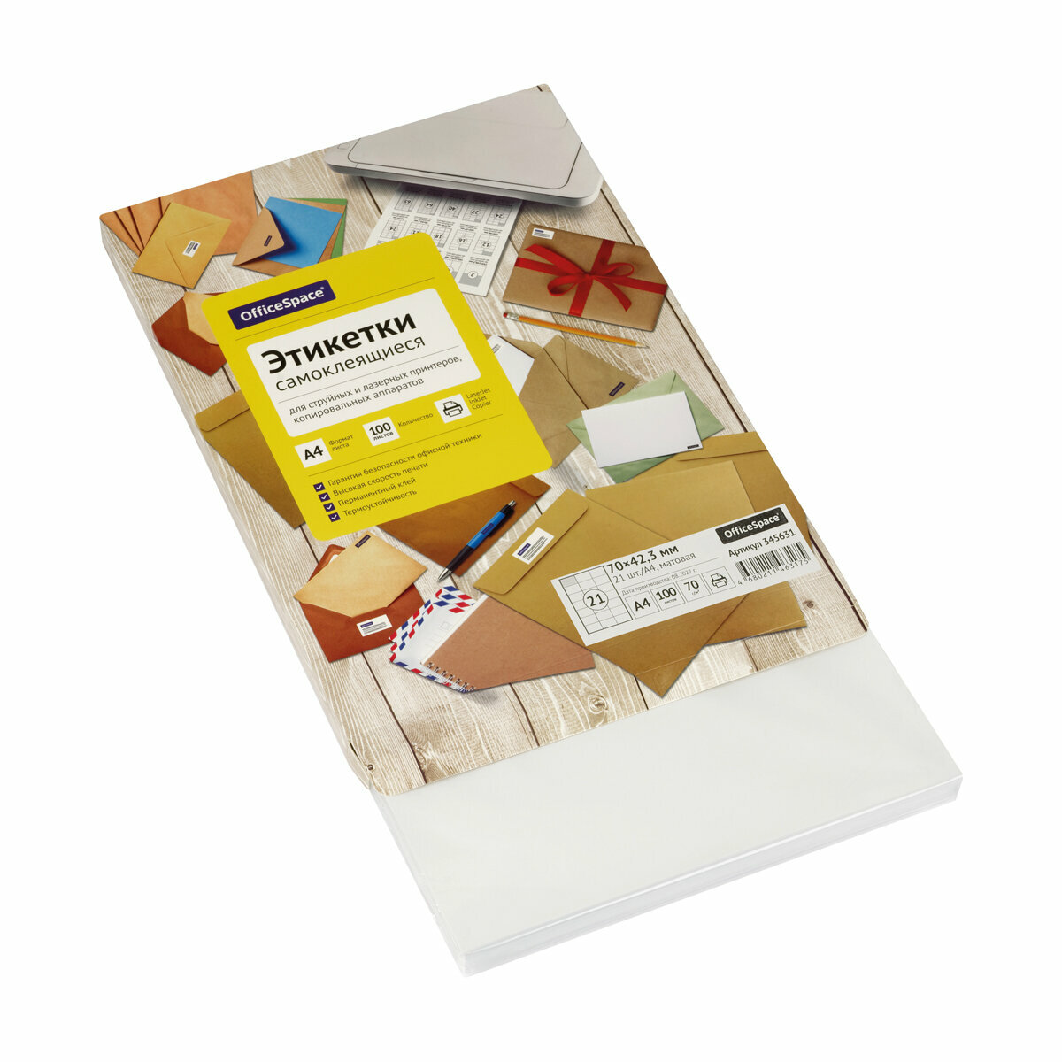 Этикетки самоклеящиеся OfficeSpace А4, 100 листов, белые, 21 фрагмент, 70х42,3 мм, 70 г/м2 (345631)