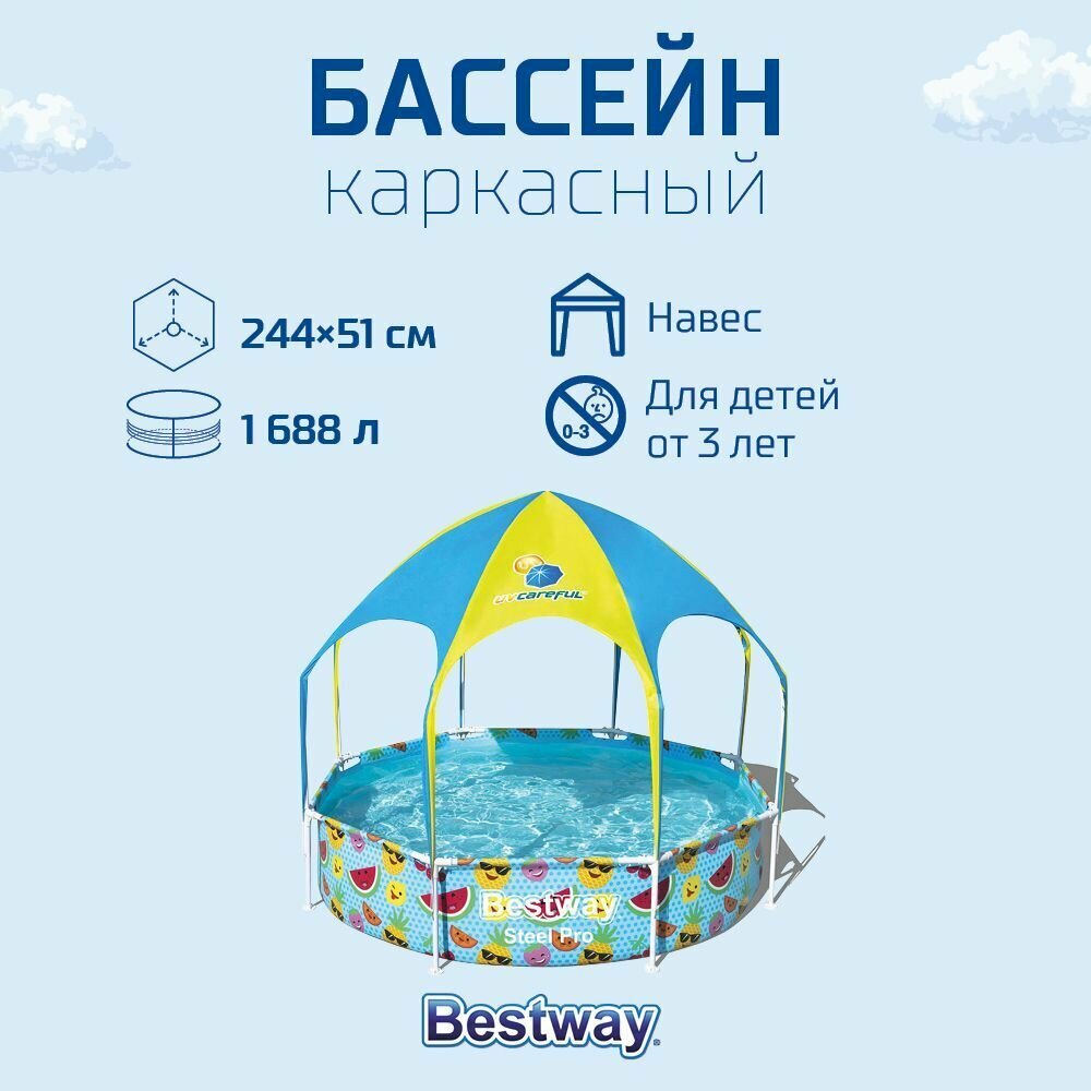 Бассейн каркасный Bestway Steel Pro с навесом 244х51 см, от 2 лет