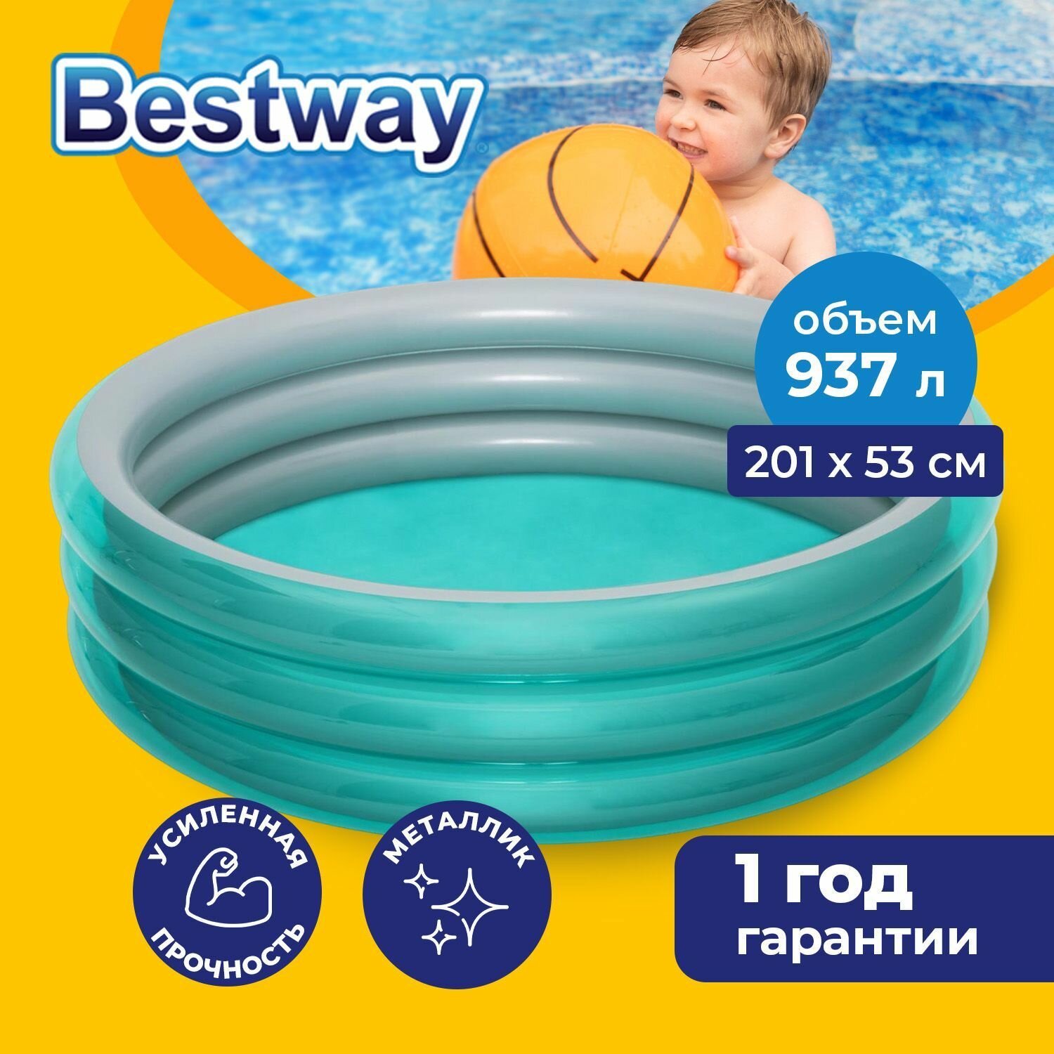 Бассейн надувной Bestway Big Metallic 3-Ring 51043 диаметр 201 см, глубина 53 см, объём 937 л, жёсткое дно