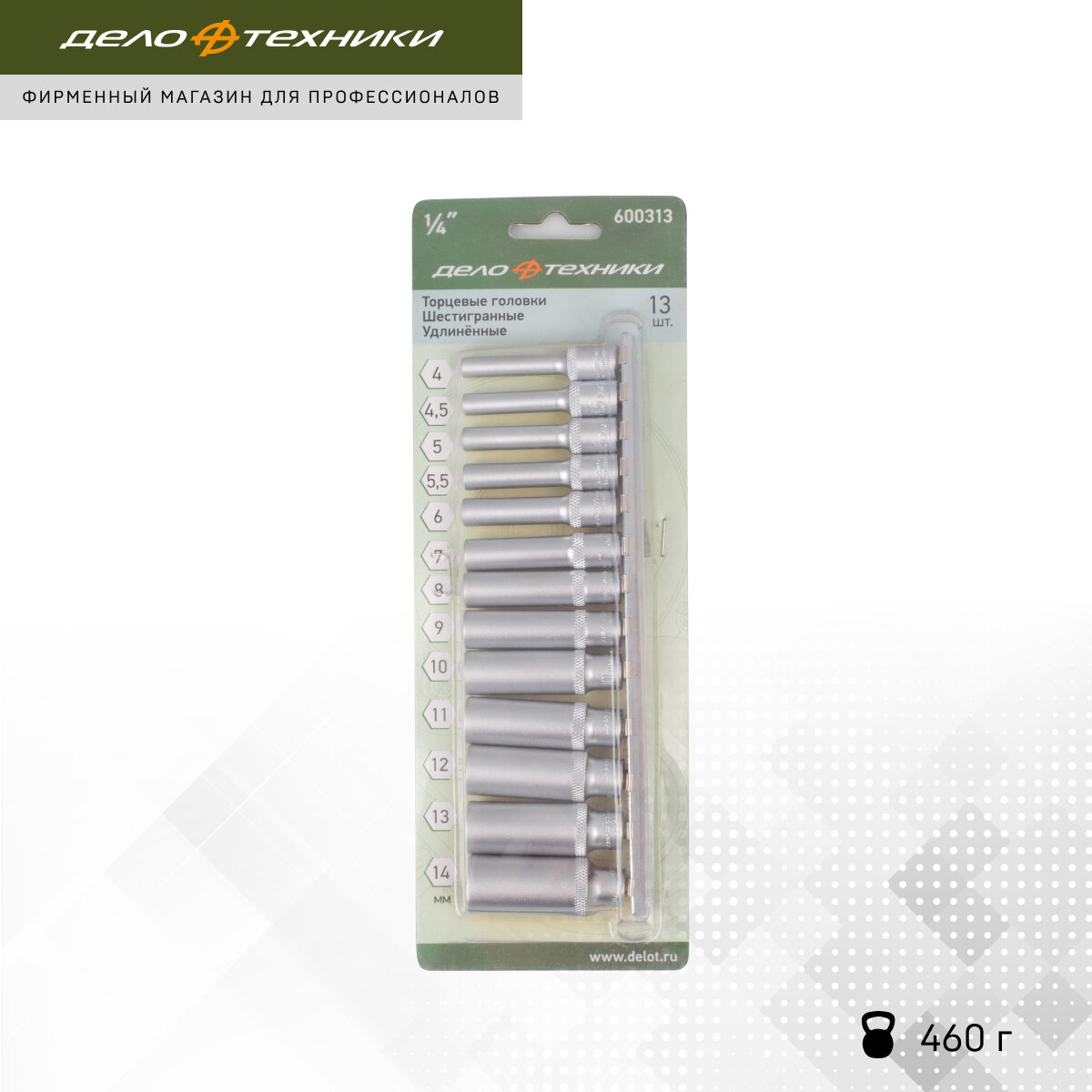 Дело техники 600313 Набор головок 6-гр длинные 1/4" 13 шт (4,4,5,5,5,6,7,8,9,10,11,12,13,14мм) 40/20