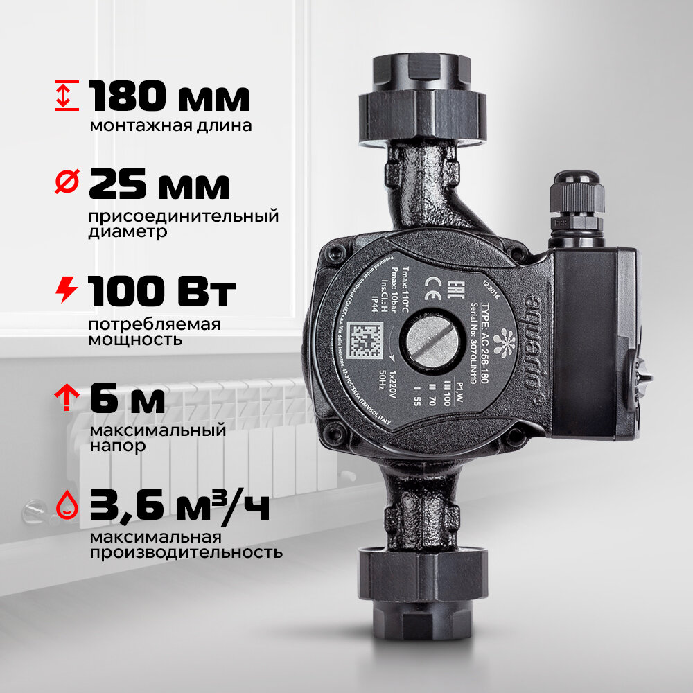 Насос циркуляционный Aquario AC 256-180 5356, 100 Вт, 60 л/мин, напор 6 м, чугун Aquario 7006524 .