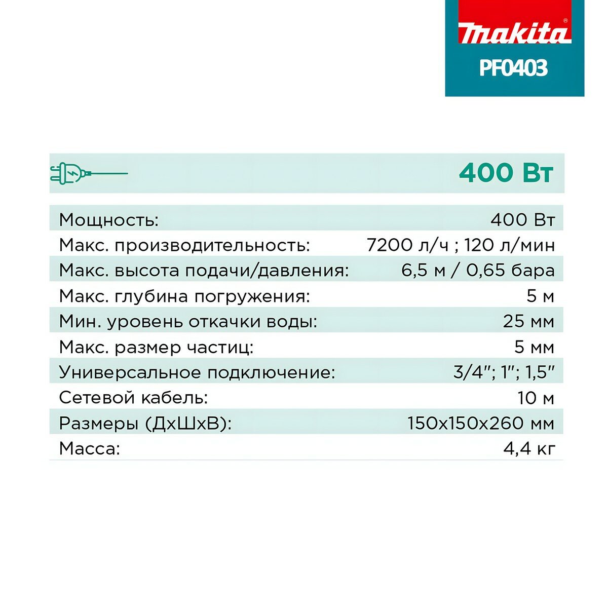 Насос дренажный Makita PF0403 7.2 куб. м/час 400 Вт