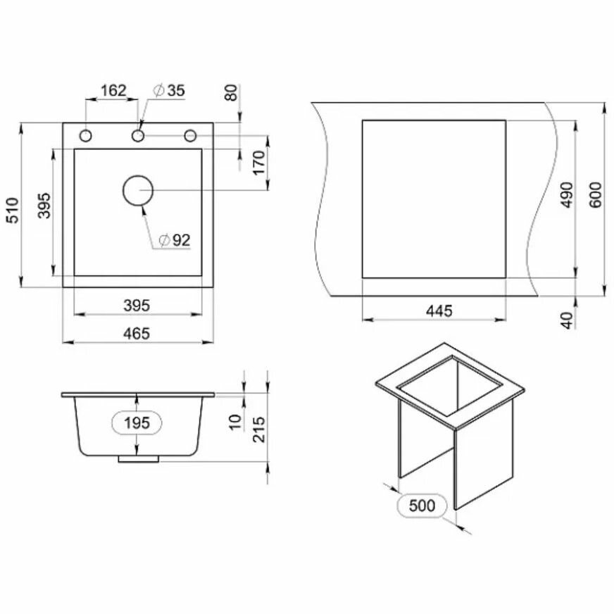 Мойка кухонная квадратная Granula, чаша 394х394 мм, 4651 сланец