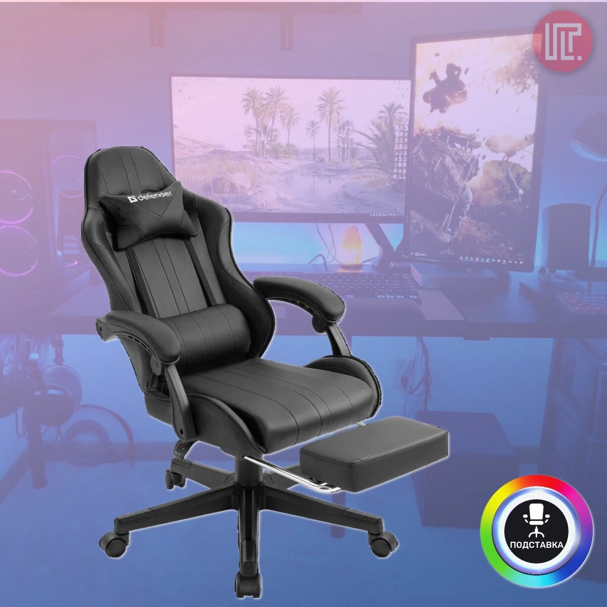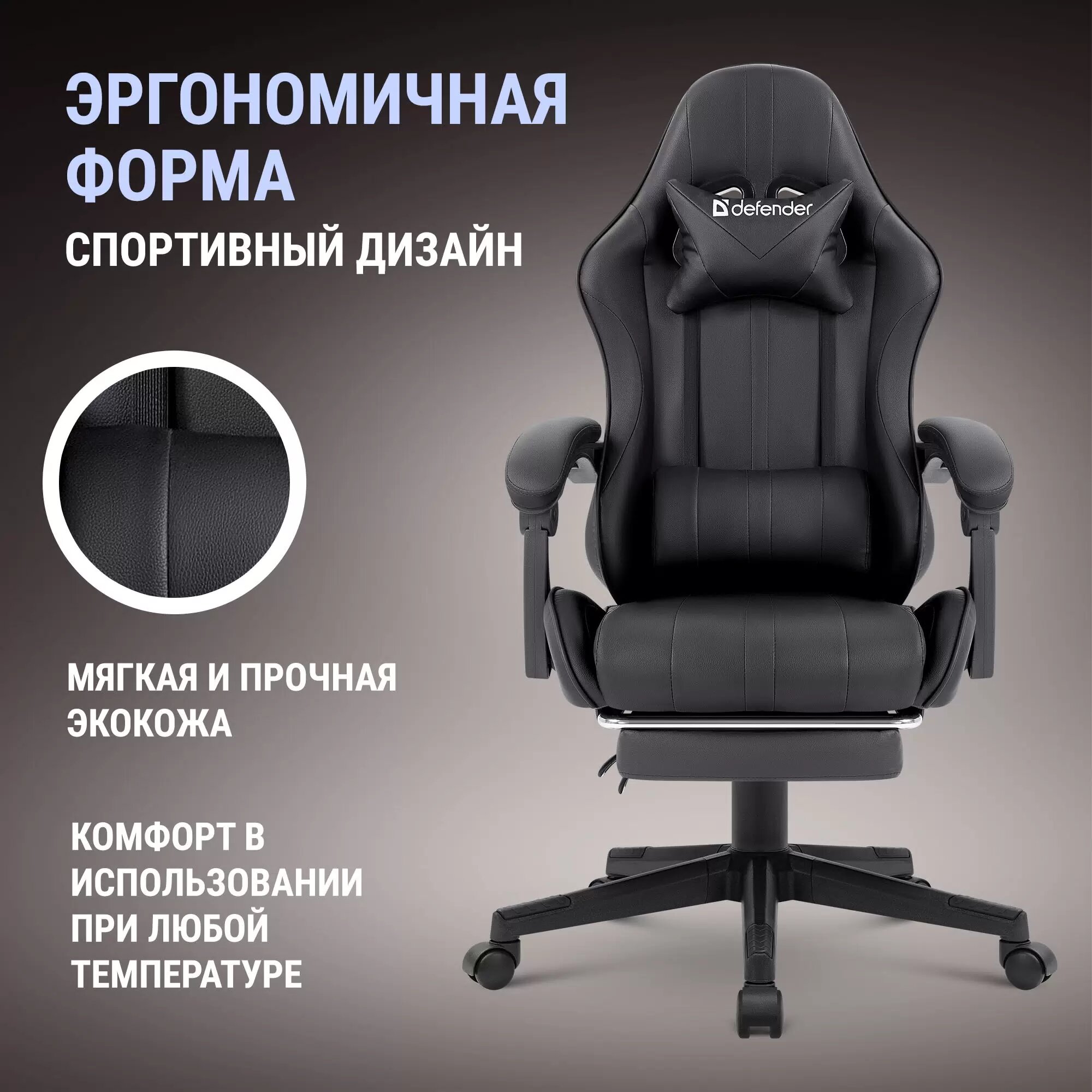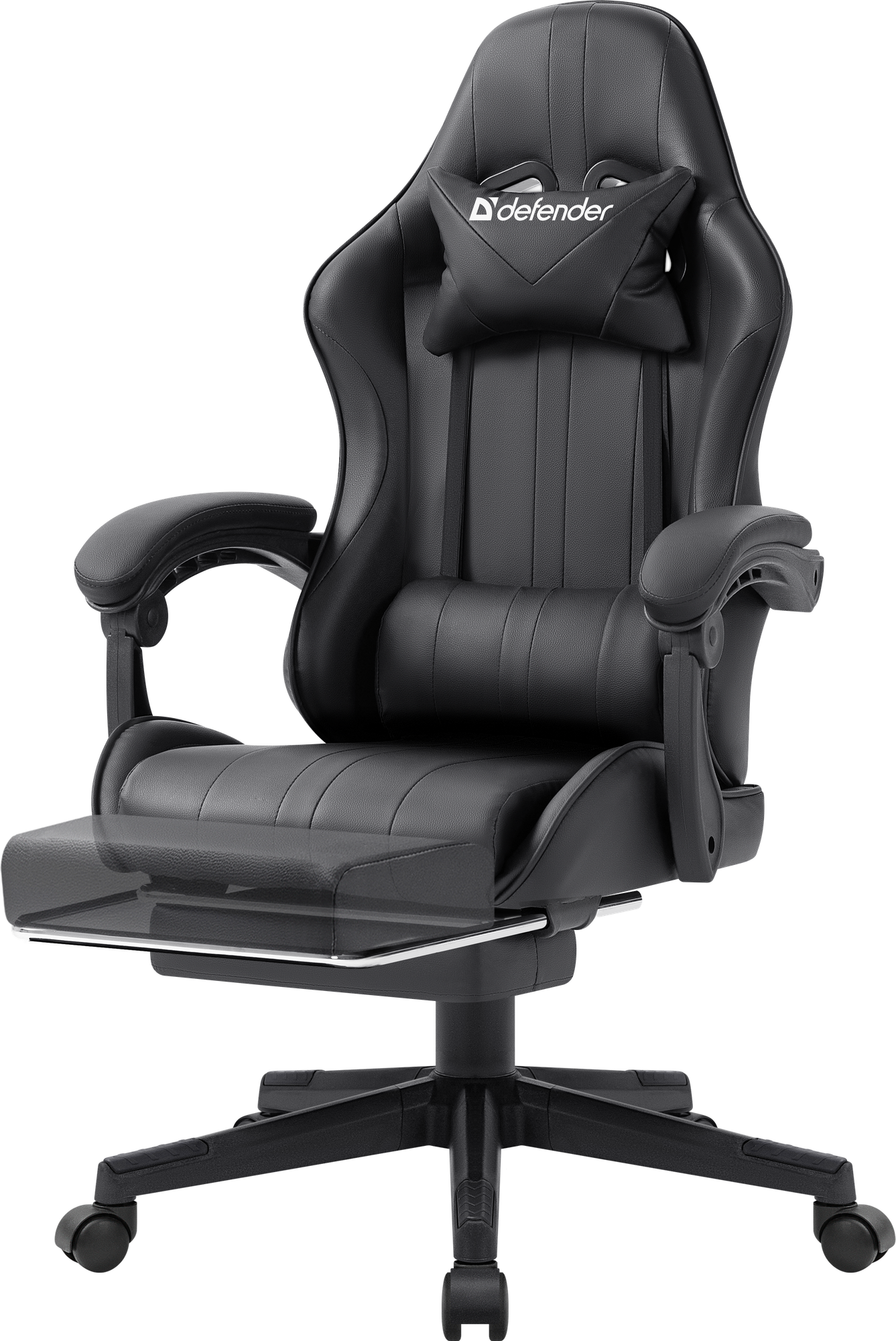 Компьютерное игровое кресло Defender Rock из эко-кожи с регулировкой высоты и подставкой для ног, на металлической раме, 2 подушки.