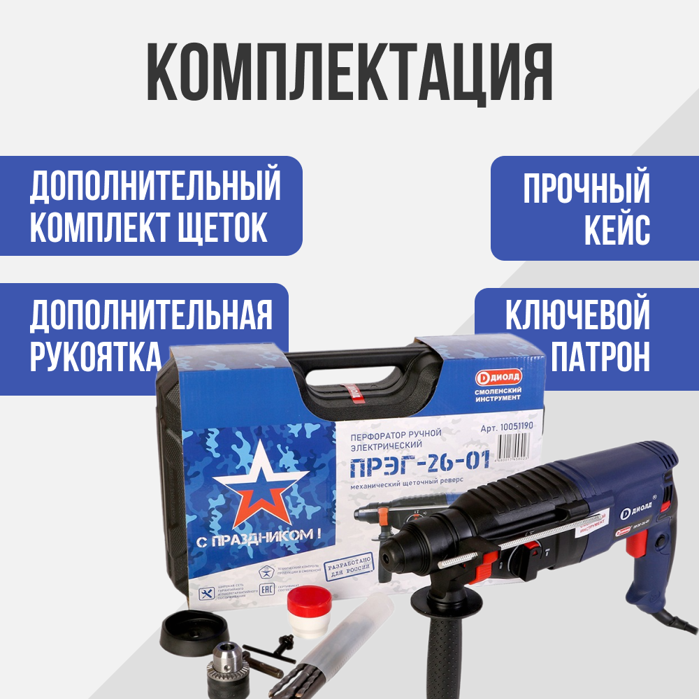 Перфоратор диолд ПРЭГ-26-01 в кейсе / регулировка частоты, 900 Вт, 3,2 Дж, 3 режима, SDS+, механический щеточный реверс, буры, пика, зубило, от сети, российский производитель