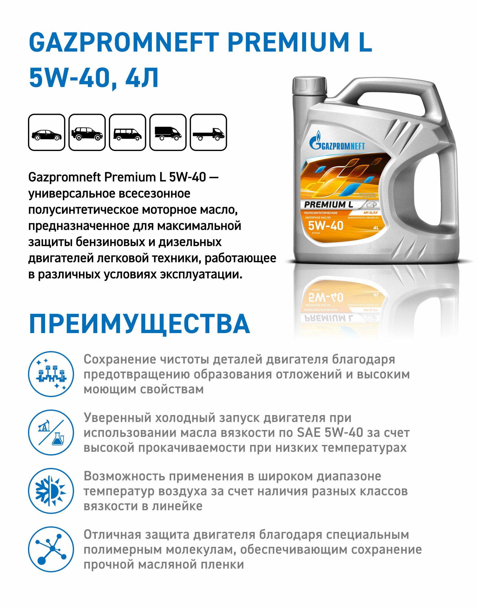 Моторное масло GAZPROMNEFT Premium L, 5W-40, 1л, полусинтетическое [2389900119]