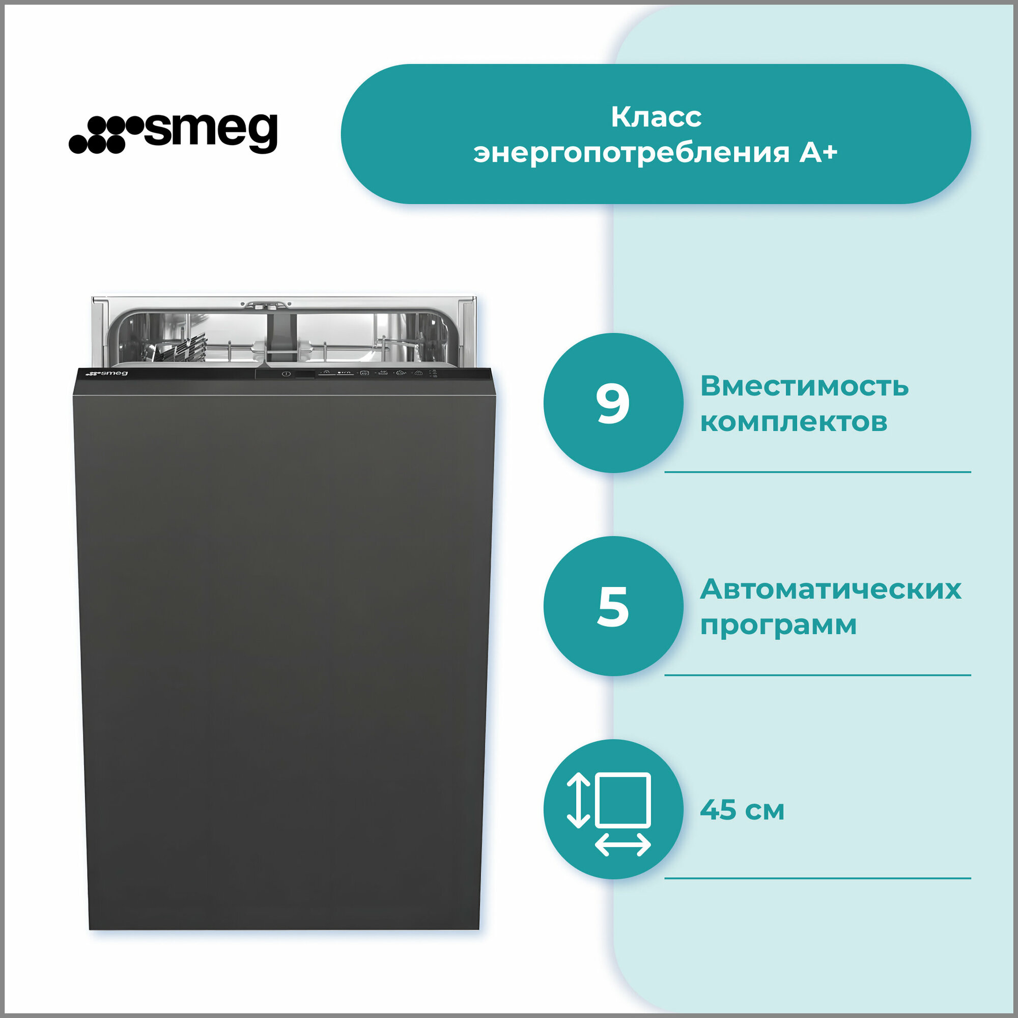 Встраиваемые посудомоечные машины SMEG/ Полностью встраиваемая, 45 см, 9 комплектов, 5 программ, инверторный мотор