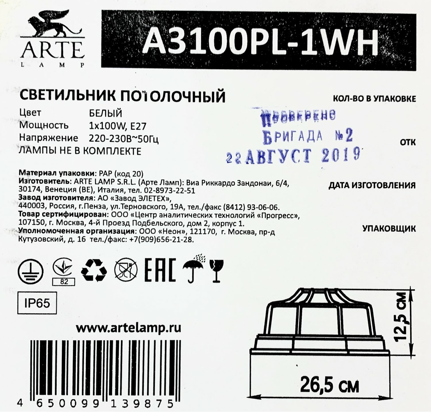 Ниже Вы можете прочитать отзывы на Уличный потолочный светильник Arte Lamp A3100PL-1WH PEGASUS IP44 под лампу 1xE27 60W, ознакомится с подробными характеристиками, посмотреть интересные обзоры и фотографии на Уличный потолочный светильник Arte Lamp A3100PL-1WH PEGASUS IP44 под лампу 1xE27 60W.
