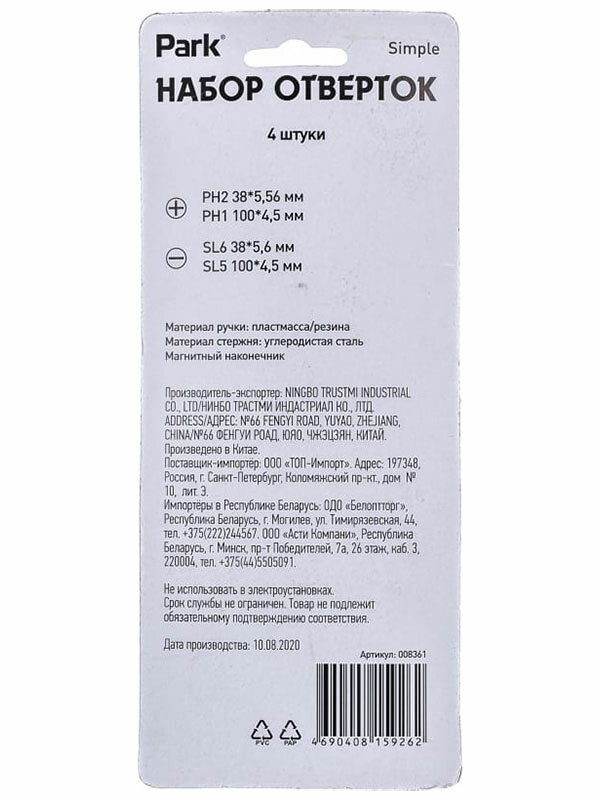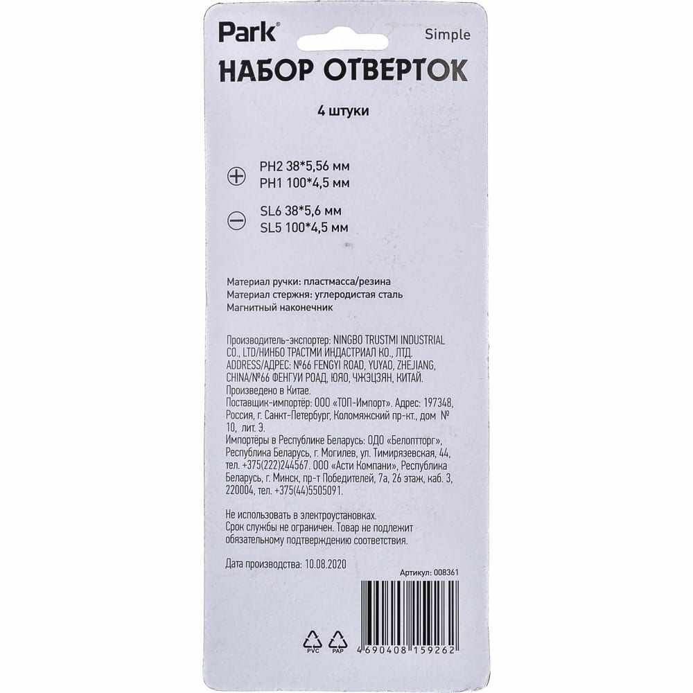 СохранитьPARK Набор отверток 4шт пластиковые рукоятки серия Simple 008361 8361 интересное: