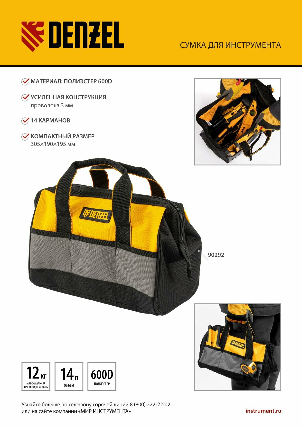 Сумка для инструмента DENZEL , 305х190х195 мм, 14 карманов, 90292