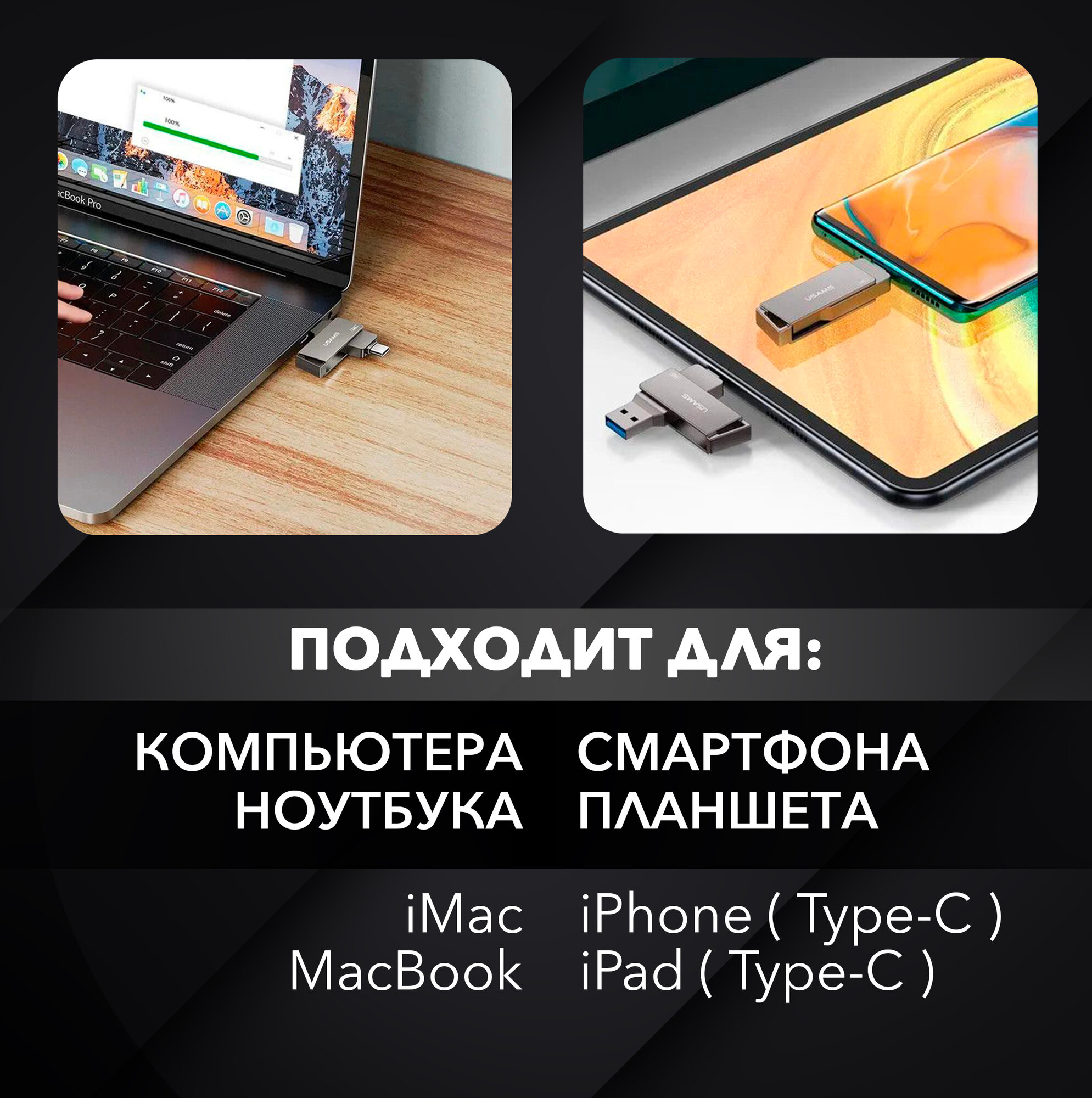 Флеш-накопитель USAMS • USB3.0 + Type-C • 128GB • OTG флешка для телефона, планшета, компьютера, ноутбука, iPhone серии 15