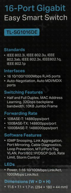 | Сетевые стандарты | IEEE 802.1q (VLAN) / IEEE 802.1p (Priority tags) / Jumbo Frame / автоопределение MDI/MDIX / IEEE 802.3ab / IEEE 802.3x / IEEE 802.3i / IEEE 802.3u |