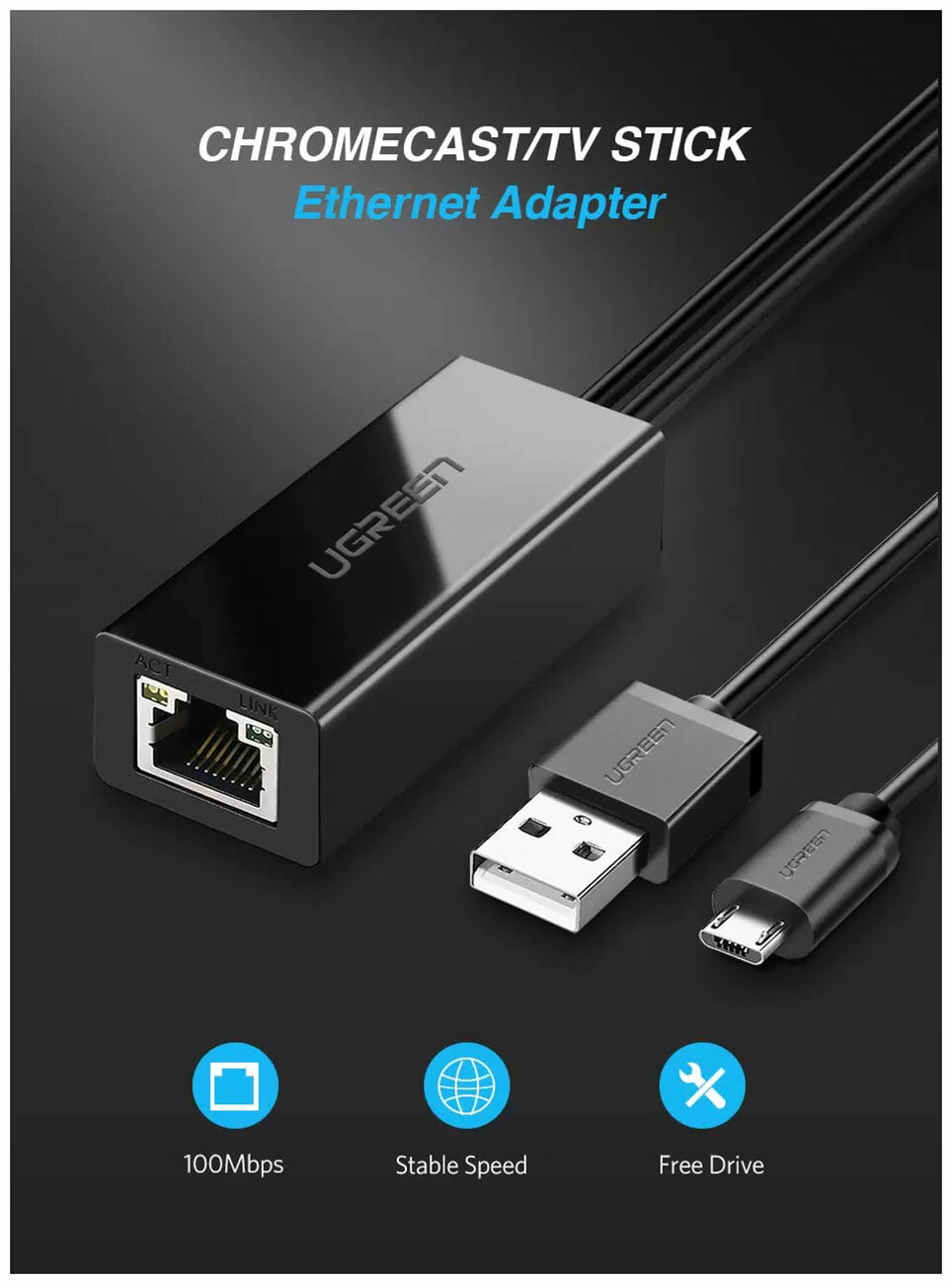 Адаптер UGREEN (30985) Micro USB 2.0 To 100Mbps Ethernet Adapter For Chromecast And Micro TV Sticks. Цвет: черный