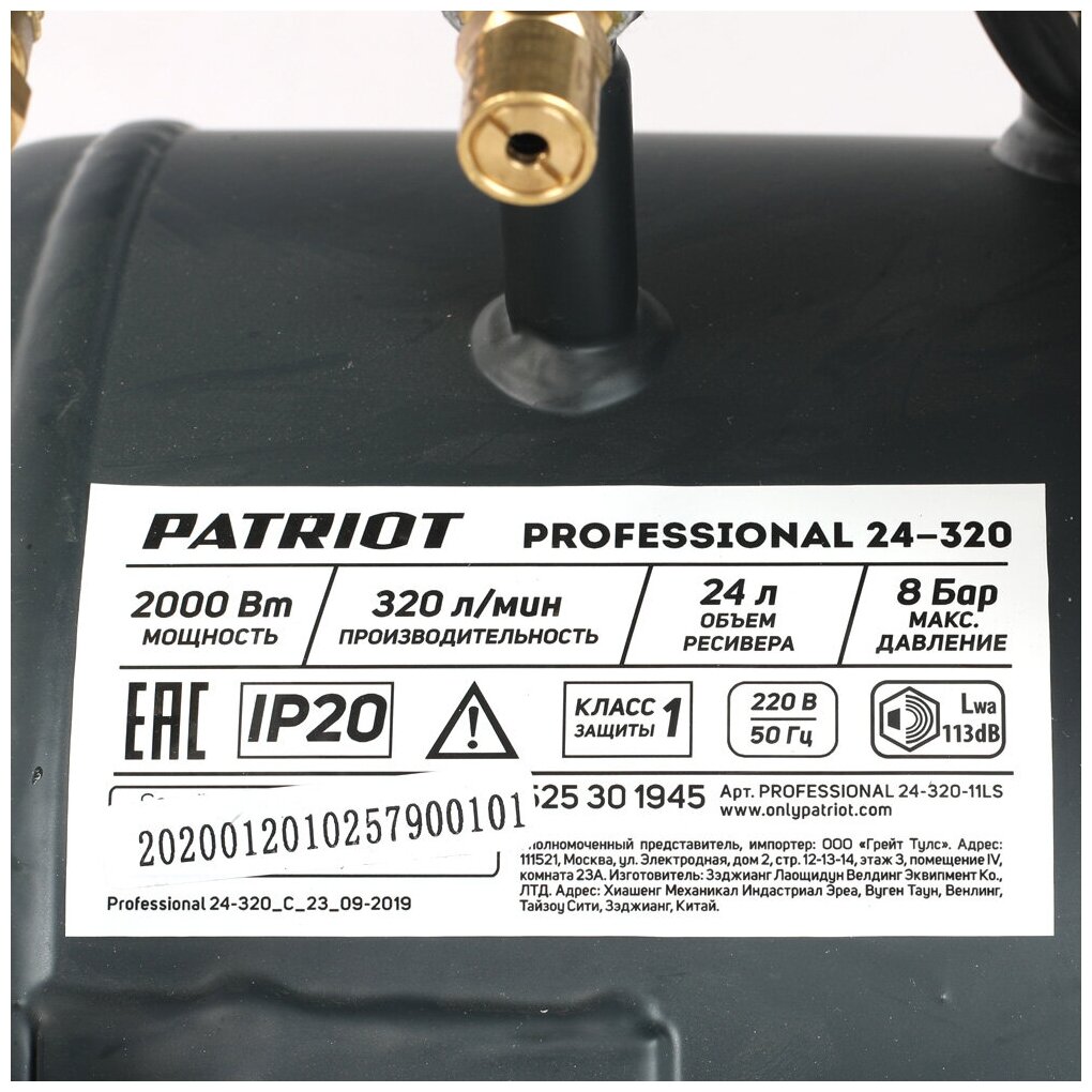 Компрессор Patriot поршневой масляный Professional 24-320, 320 л/мин, 8 бар, 2000 Вт, 24 л, быстросъемный 1/4" + "елочка" PATRIOT 525301945