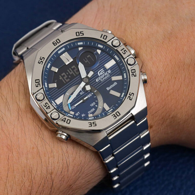 Наручные часы CASIO мужские Edifice ECB-10D-2A кварцевые, встроенная память, будильник, настройка времени с помощью приложения, хронограф, секундомер, таймер обратного отсчета, водонепроницаемые, подсветка стрелок, подсветка дисплея, серебряный