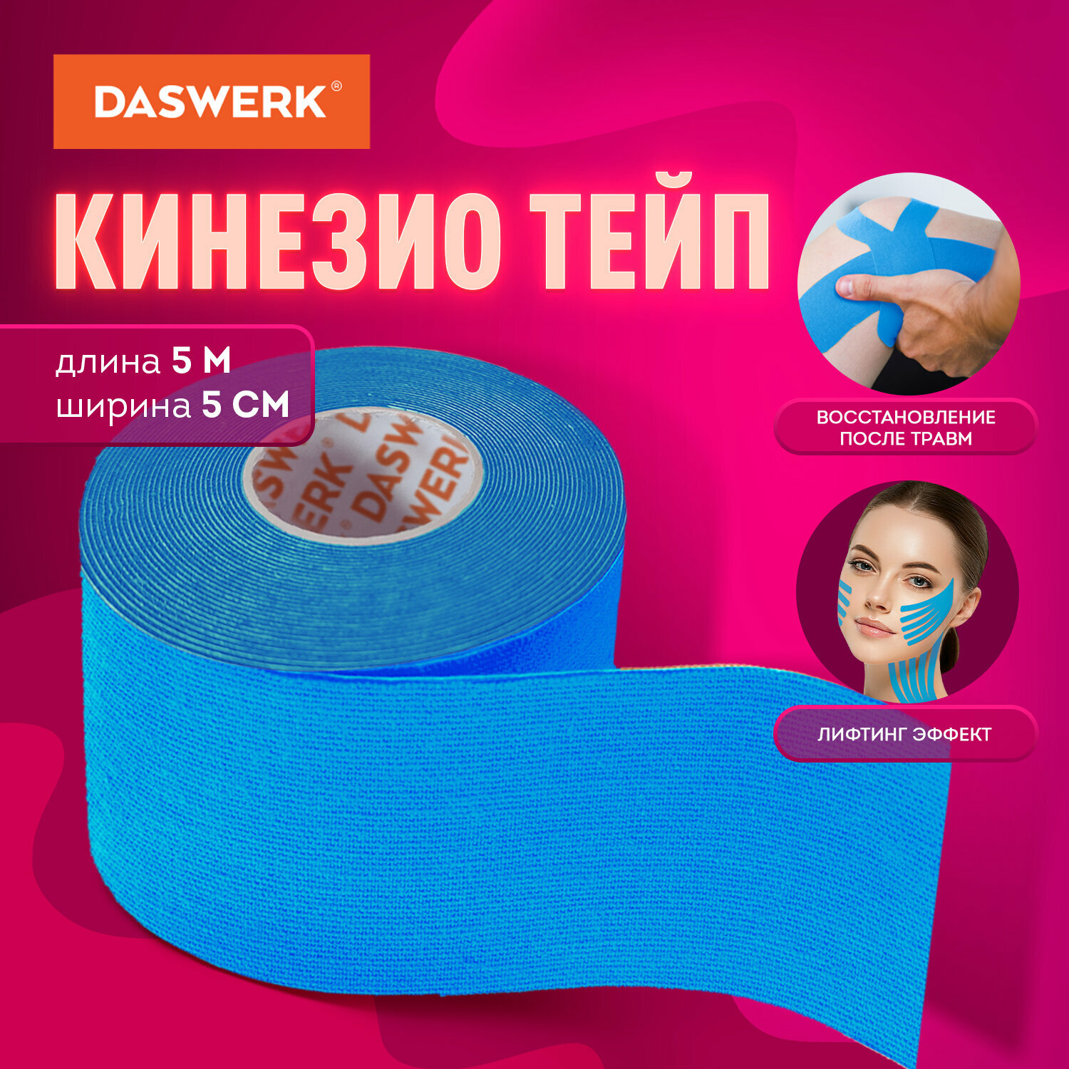 Кинезио тейп/лента для лица и тела, омоложение и восстановление, 5 см х 5 м, синий, DASWERK, 680007