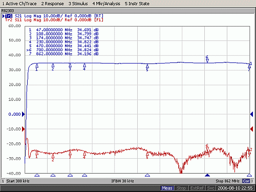 | Дополнительная информация | частотный диапазон: 47-862 MHz; коэффициент усиления, dB 34; неравномерность АЧХ, dB ±0.7; пределы регулировки коэффициента усиления: dB 0...-20; пределы регулировки наклона АЧХ: dB 0...-18; максимальный выходной уровень, IMD3=60 dB (DIN45004B) 117 dBµV; максимальный выходной уровень, СТВ CSO (EN50083-3) 101 dBµV Вх. и вых.; коэффициент отражения*, dB > 14; коэффициент шума, dB < 7; ослабление тестовой точки, dB -7; потребляемая мощность: 5VA/230 V/50Hz; диапазон рабочих температур: °C -20... +50 |