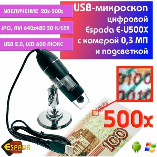 Портативный цифровой USB-микроскоп Espada E-U500X c камерой 1,3 МП и увеличением 500x