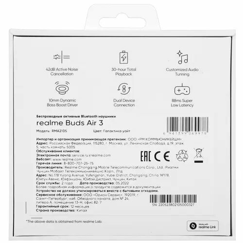 Xiaomi Realme Buds Air 3 Наушники внутриканальные с шумоподавлением Космический белый