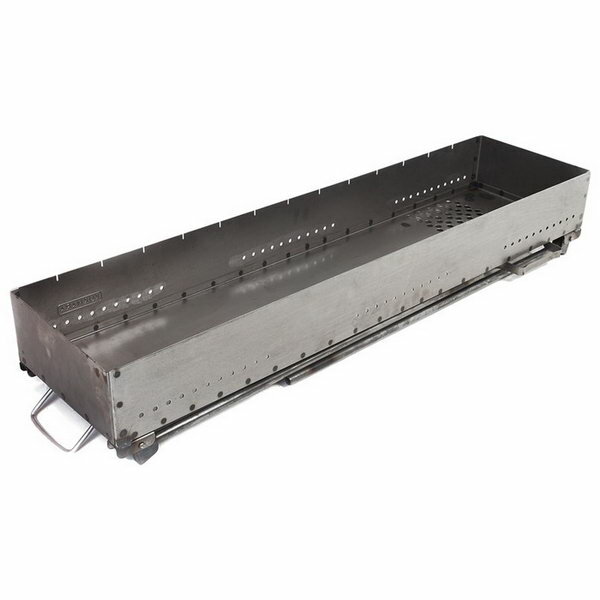 Прикольный лоточек для сбора и удаления золы - удобно, не нужно кувыркать мангал, чтобы вытрясти пепел. У мангала удобные ручки, легко перенести его на другое место. Это лучше делать вдвоем - мангал длинный, одному неудобно тащить, а если он раскаленный - то и небезопасно. |