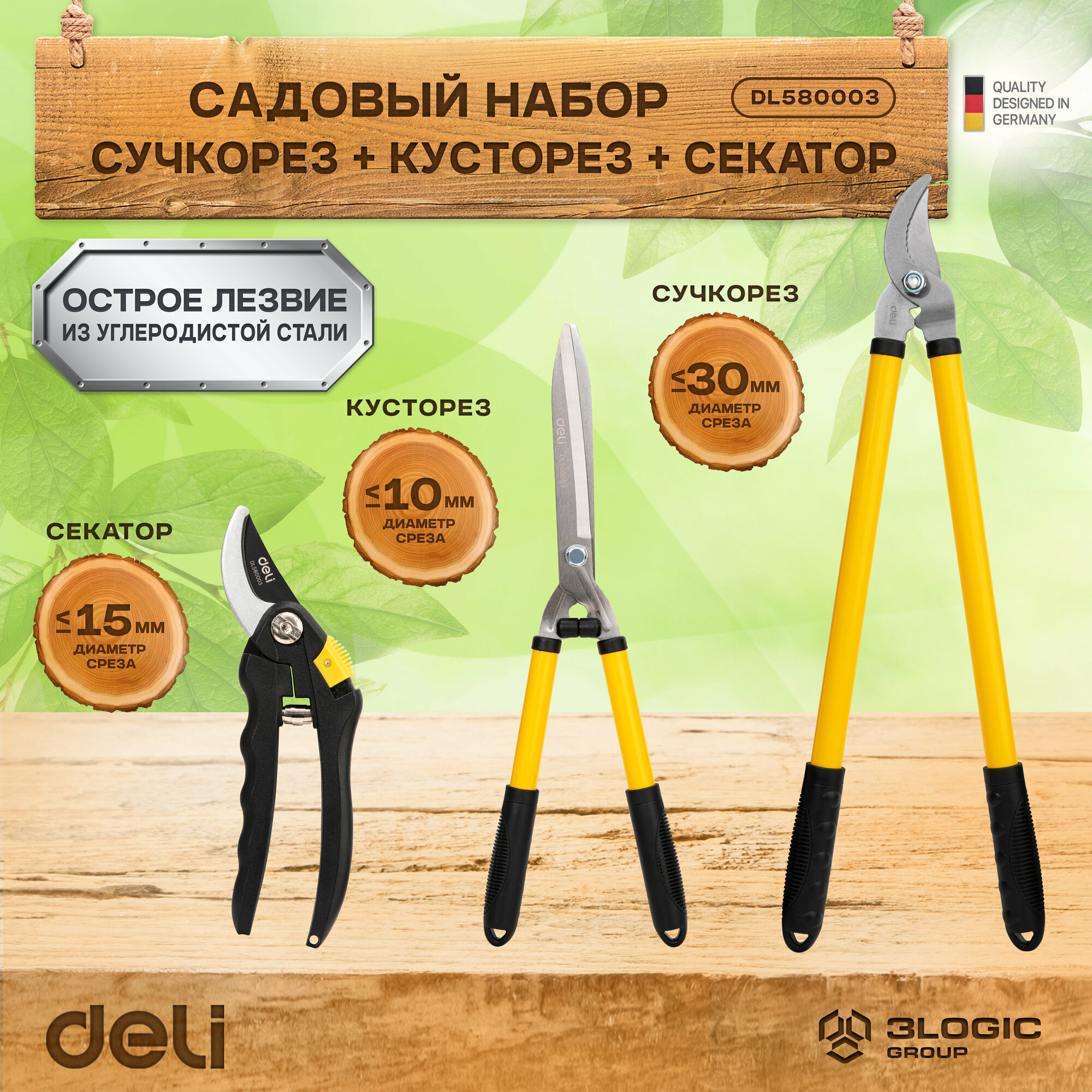 Набор для сада и огорода (сучкорез, кусторез, секатор) Deli DL580003 (термообработанная поверхность, противоскользящая рукоять, сталь 55С)