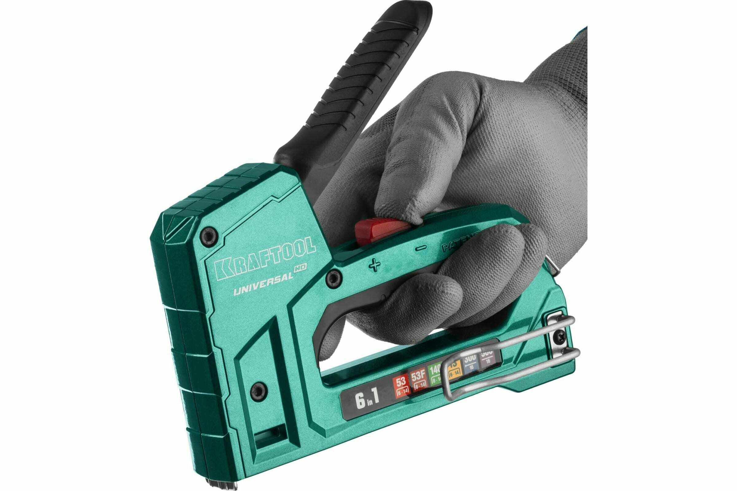 Kraftool Степлер для скоб "Universal HD" 6-в-1: 53 6-14 мм 53F 8-14 мм 140 8-14 мм 13 6-14 мм 300 16 мм 500 16 мм , литой, алюм. корп., 3188
