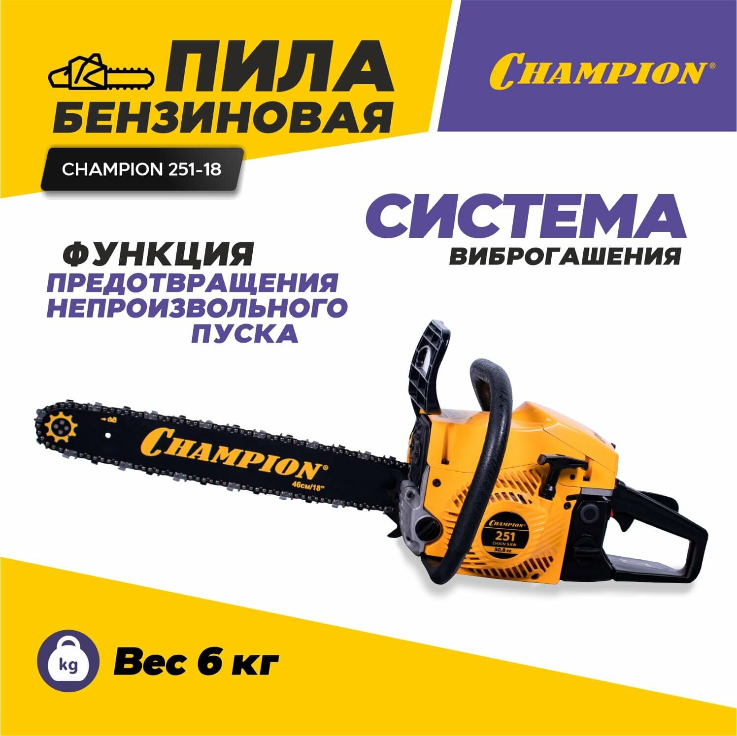 Бензопила цепная бензиновая CHAMPION 251-18 (2.3 кВт, 50.8 см3, легкий старт, 5.6 кг)